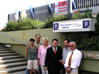 Bürgermeister Klaus Müller, Finanzdezernent Harald Drees und Vertreterinnen des KIM und der Fa. Hygiene & Service bei der Übergabe der Toilettenanlage am Schillerplatz