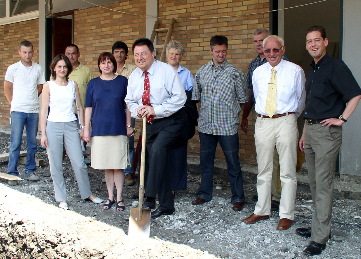 Bürgermeister Klaus Müller, Finanzdezernent Harald Drees, Schulleiterin Petra Ninnemann und Mitarbeiter des KIM und der städtischen Schulverwaltung beim symbolischen Spatenstich an der Grundschule Sümmern