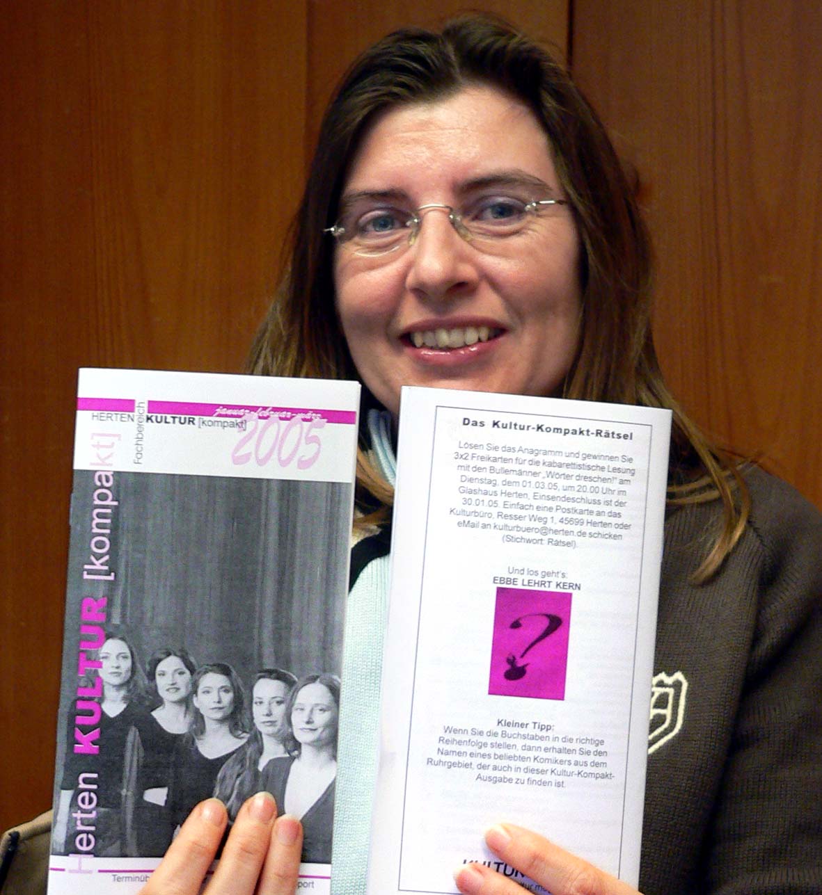 Sylvia Seelert vom Kulturbüro der Stadt Herten präsentiert die neue Ausgabe von "Kultur kompakt" - erstmals mit einem Rätsel auf der Rückseite.