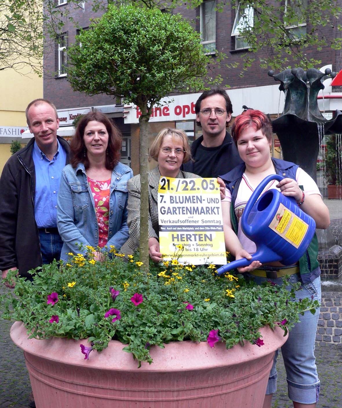 Sie sorgten mit zwei bunt bepflanzten Kübeln schon einmal für Vorfreude auf den 7. Blumenmarkt (v.l.): Stefan Klümper (Stadt Herten), Heike Anders (Agentur Prinz), die stellvertretende Bürgermeisterin Margret Gottschlich, Henning Prinz (Agentur Prinz) und Melanie Gottschling vom Pflanzencenter Gottschling.