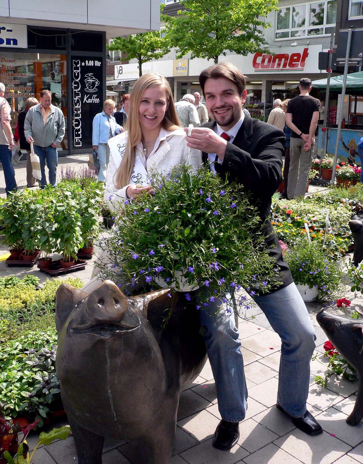 Auf einer Schweineskulptur sitzend zeigen Bürgermeister Dr. Uli Paetzel und die Deutsche Blumenfee Heike Persch eine Blumenampel.
