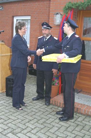 Medienarchiv Bürgermeisterin Schlag überreicht Zugführer Peter Janssen drei Bilder. In der Mitte: Stadtbrandmeister Karl Kettler