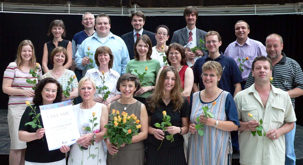 Bürgermeister Dr. Uli Paetzel und Fachbereichsleiter Ulli Stromberg gratulierten dem Team der Stadtbibliothek zum 1. Platz in NRW und dem 2. Platz bundesweit im BIX 2005.