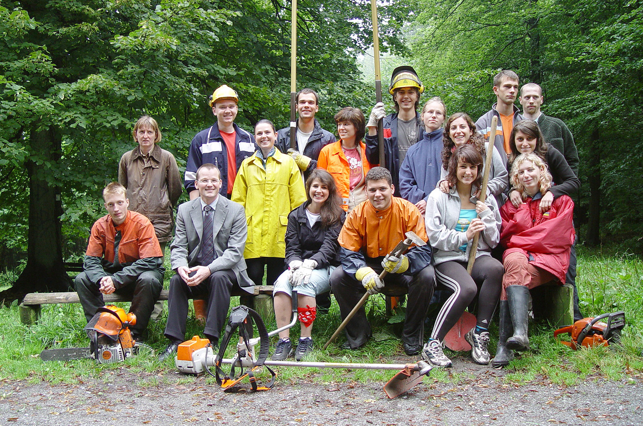 isb-Leiter Uwe Ziemann (vorne 2. v.l.) und Stadtförsterin Julia Borghoff-Grundmann (hinten links) mit den Teilnehmern des diesjährigen ijgd-Workcamps im Iserlohner Stadtwald. Foto: Stadt Iserlohn