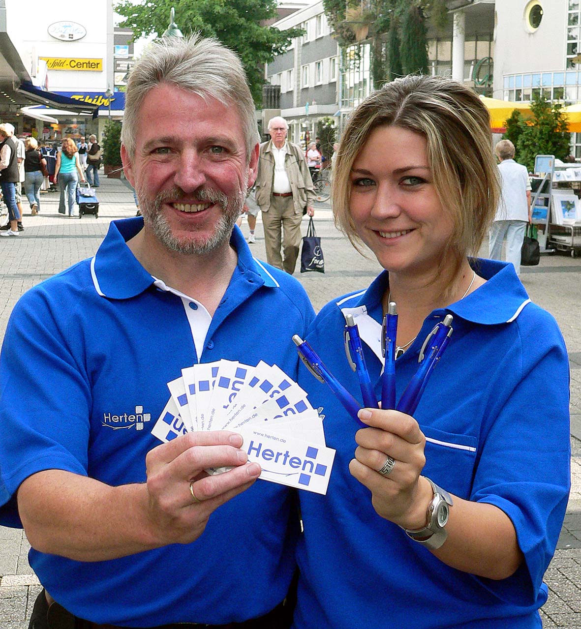 Adrian Gülden, Vorsitzender des Verkehrsvereins, und Nele Däubler, Pressesprecherin der Stadt, präsentieren die Produktpalette: Kugelschreiber, Aufkleber und hochwertige Polo-Shirts.