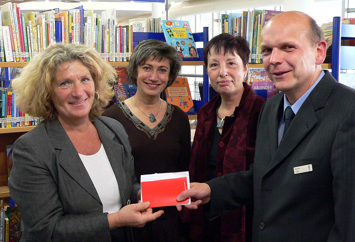 Spendenübergabe vor Ort: Michael Flohr, stellvertretender Marktbereichsleiter der Sparkasse Vest Recklinghausen, übergibt der Vorsitzenden des Vereins zur Förderung der Stadtbibliothek im Glashaus, Ruth Heine, die 100 Euro. Mit dabei: Geschäftsführerin Cornelia Berg (2.v.l.) und die stellvertretende Vorsitzende, Dr. Reinildis Hartmann.