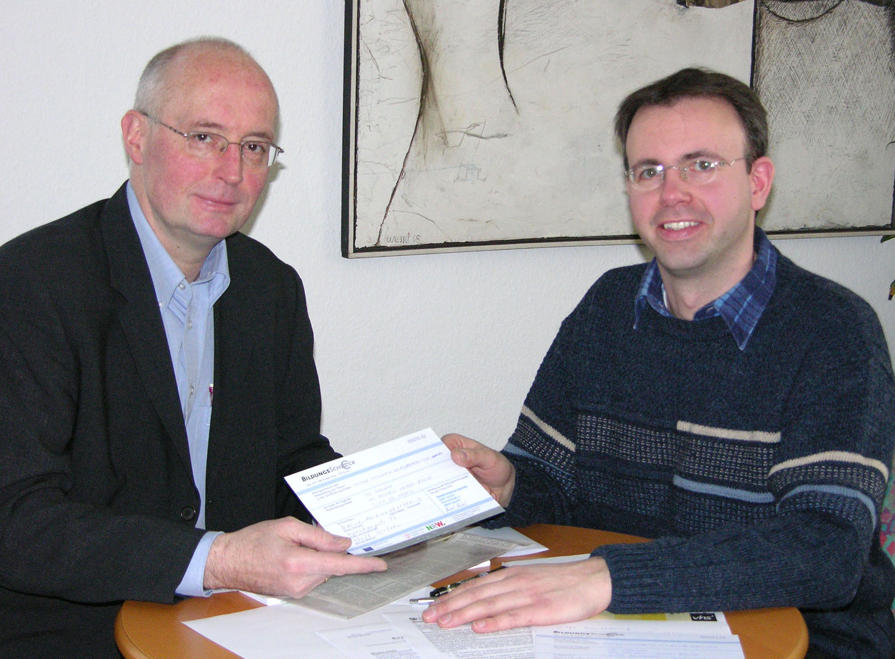 Berater Norbert Merkel übergibt Firmenchef Christian Blatt zwei Firmen-Bildungsschecks für die Fortbildung von Mitarbeitern der Firma Fürstenberg-Parkett.