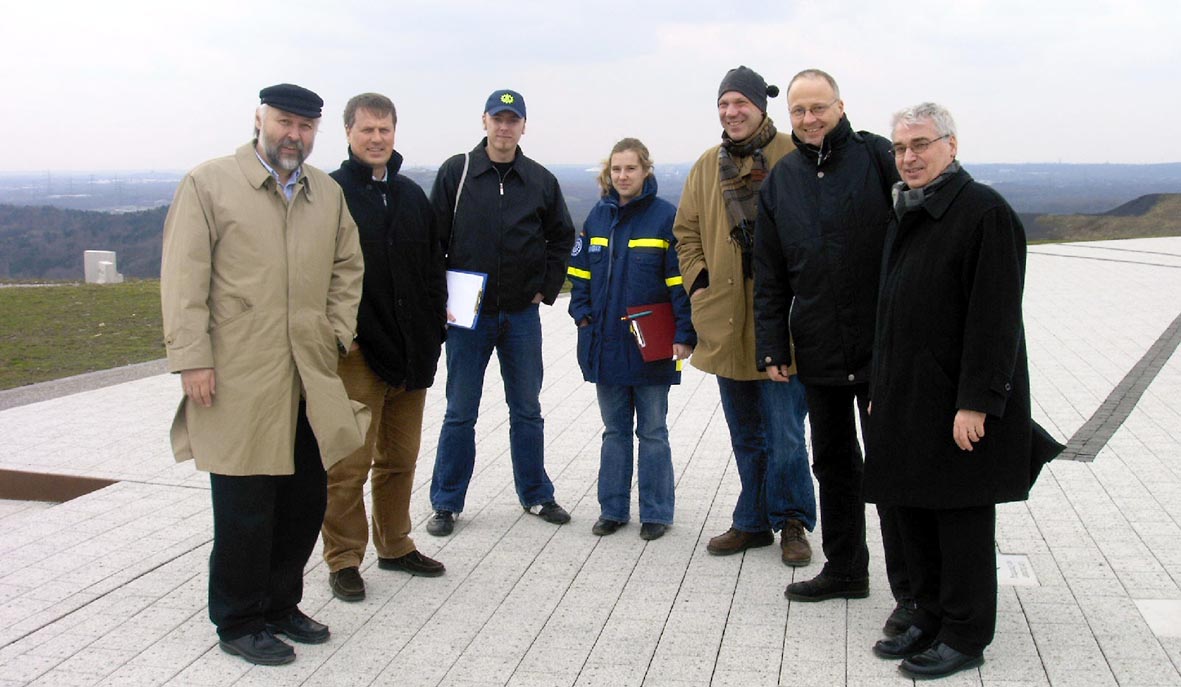 Beim Ortstermin für die Vorbereitung des WM-Gottesdienstes auf der Halde: (v.l.) Josef Haug (Stadt Herten), Christoph Haep (RVR), Jörn Christoph, Lydia Seifert (beide THW), Pfarrer Andreas Wilkens, Pfarrer Norbert Mertens und Michael Polubinski (WM-Beauftragter).
