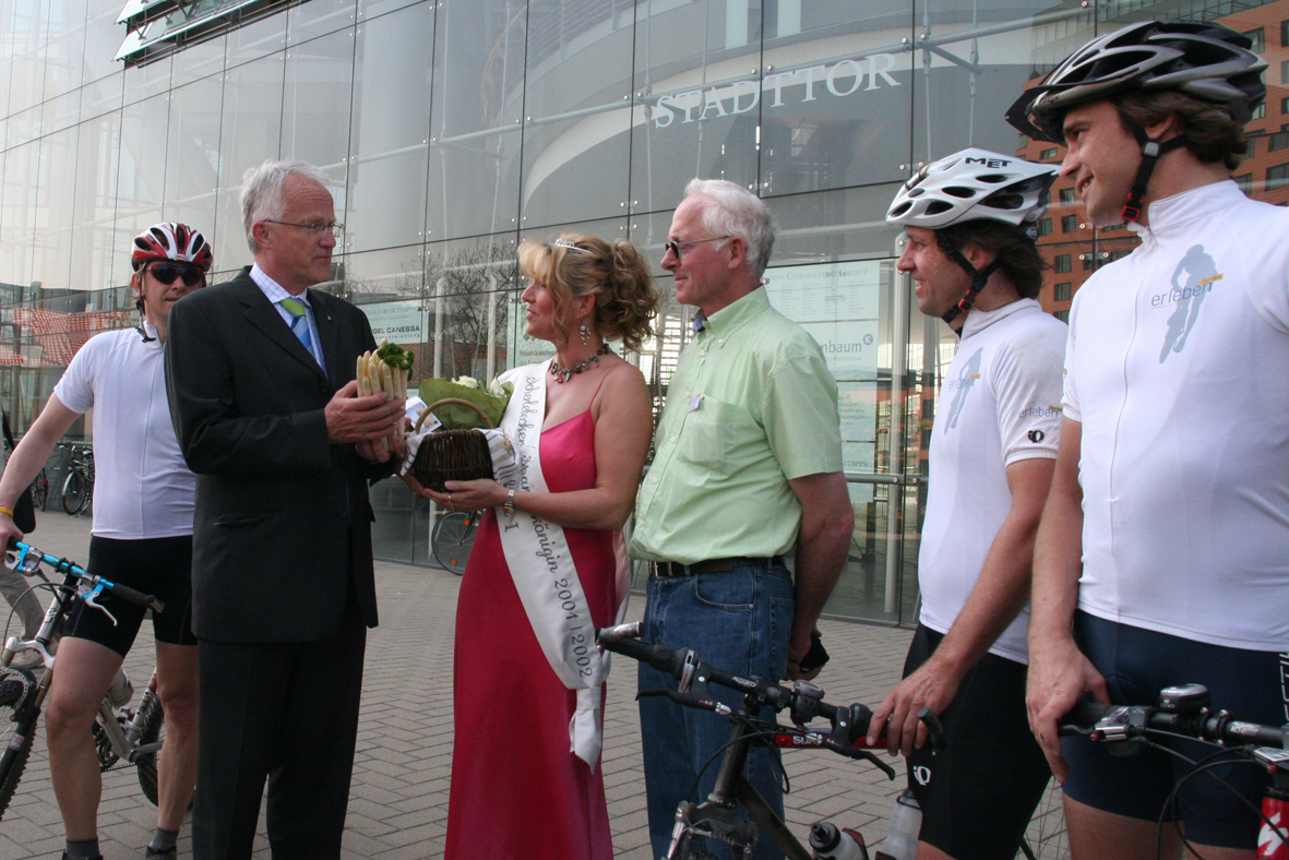 v.l.: Georg Grohs (Förderverein Europäisches Mountainbike-Zentrum in NRW e.V.), Ministerpräsident Jürgen Rüttgers, Spargelkönigin Barbara I., Bauer Ludger Südfeld und Oliver Mau und Tom Stahlhut (Förderverein Europäisches Mountainbike-Zentrum in NRW e.V.) vor der Staatskanzlei in Düsseldorf.