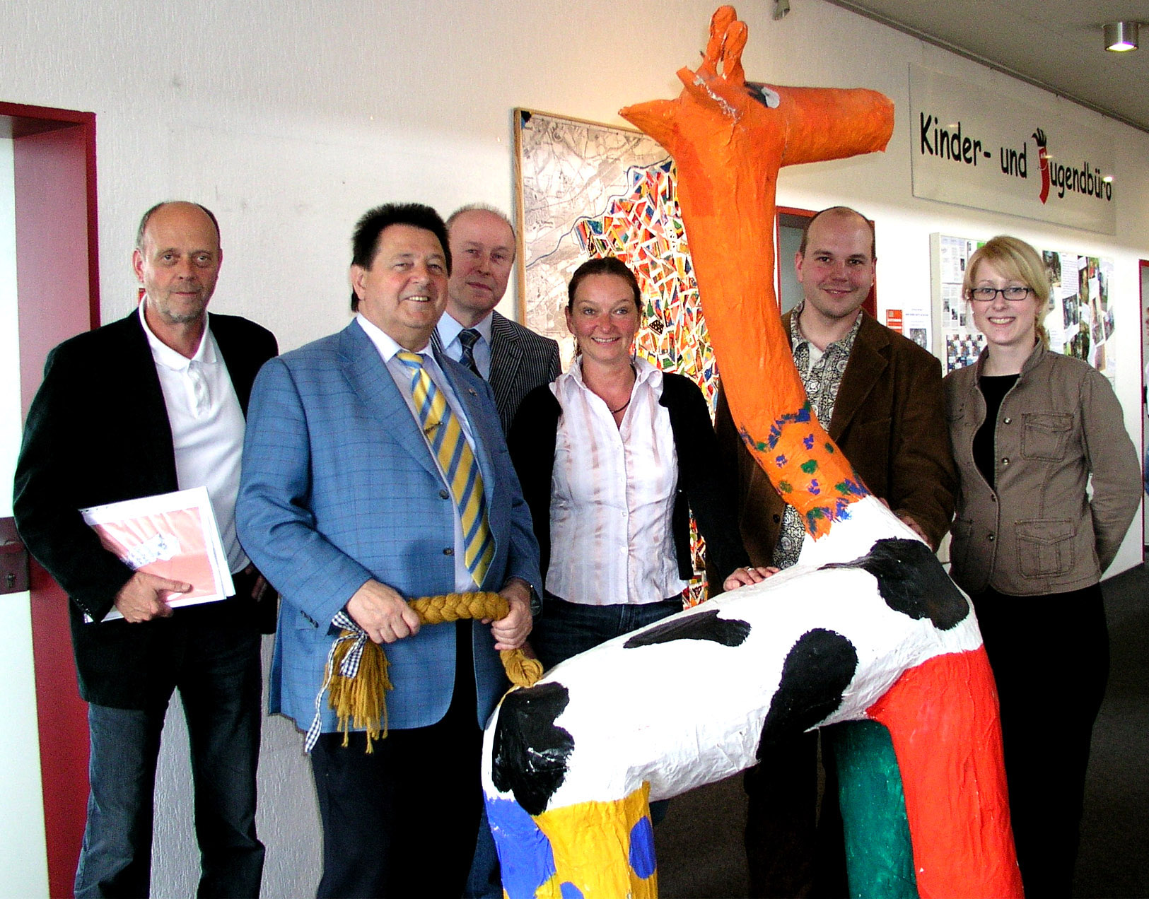 Nahmen bei der Vorstellung der LBS-Studie zum Thema "Wohnen" das Maskottchen des Kinder- und Jugendbüros in ihre Mitte (v.l.n.r.): Karl Fels, Ressortreferatsleiter Planen, Bauen, Wohnen, Bürgermeister Klaus Müller, Reiner Schäfer, Gebietsleiter der LBS, Petra Lamberts, Leiterin des Kinder- und Jugendbüros sowie Dr. Christian Klöcker und Kathrin Müthing, ProKids-Institut Herten.
