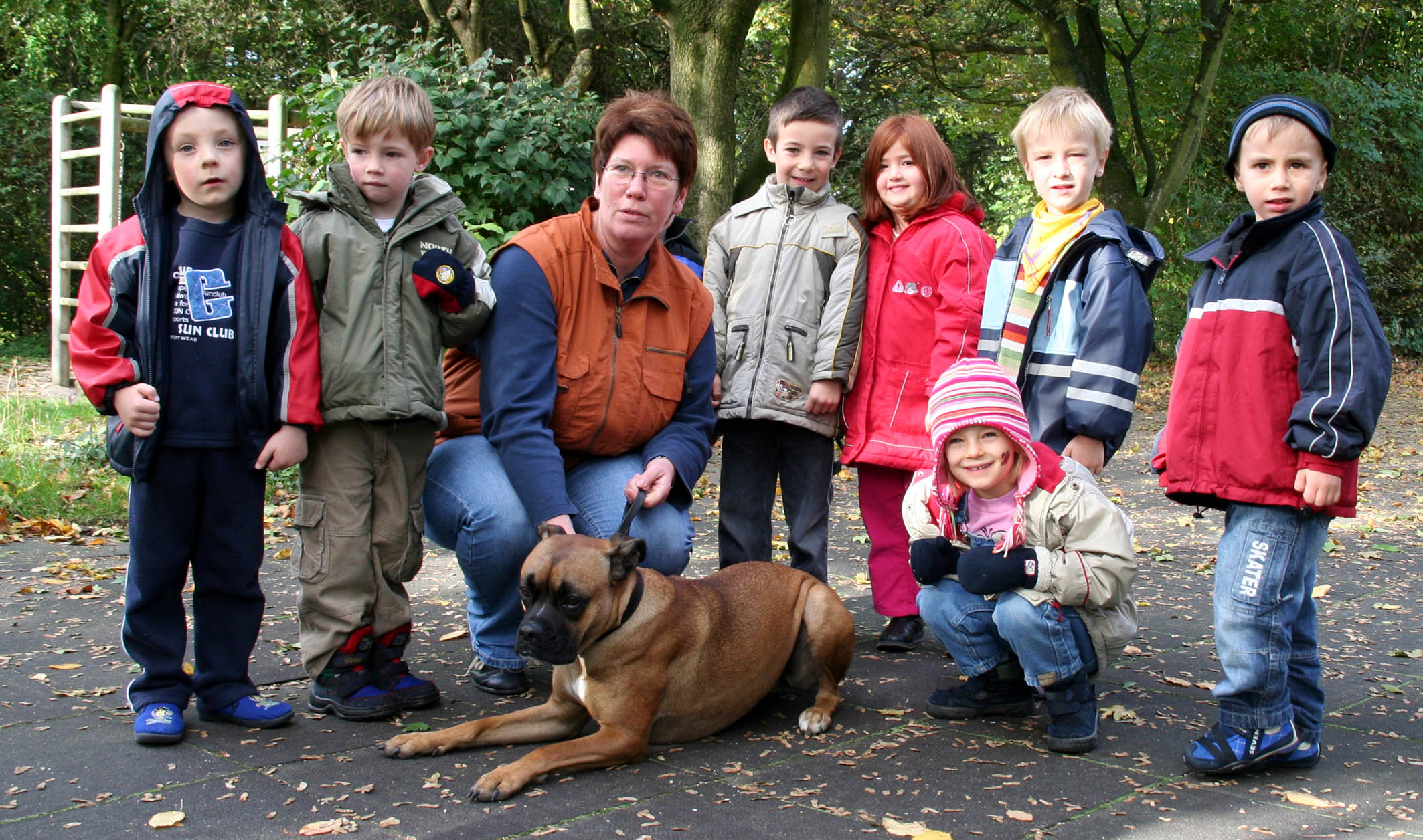 Die Kinder aus dem städtischen Kindergarten KiKo haben keine Angst mehr vor Boxermischling Cara. Petra Giebisch hat ihnen die Angst genommen.