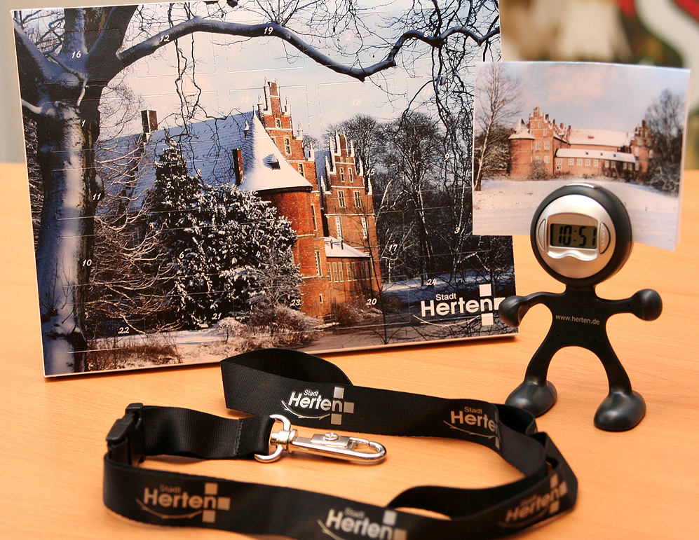 Der neue Herten-Adventskalender, das Wecker-Männchen und Schlüsselbänder -ab sofort im Rathaus erhältlich.