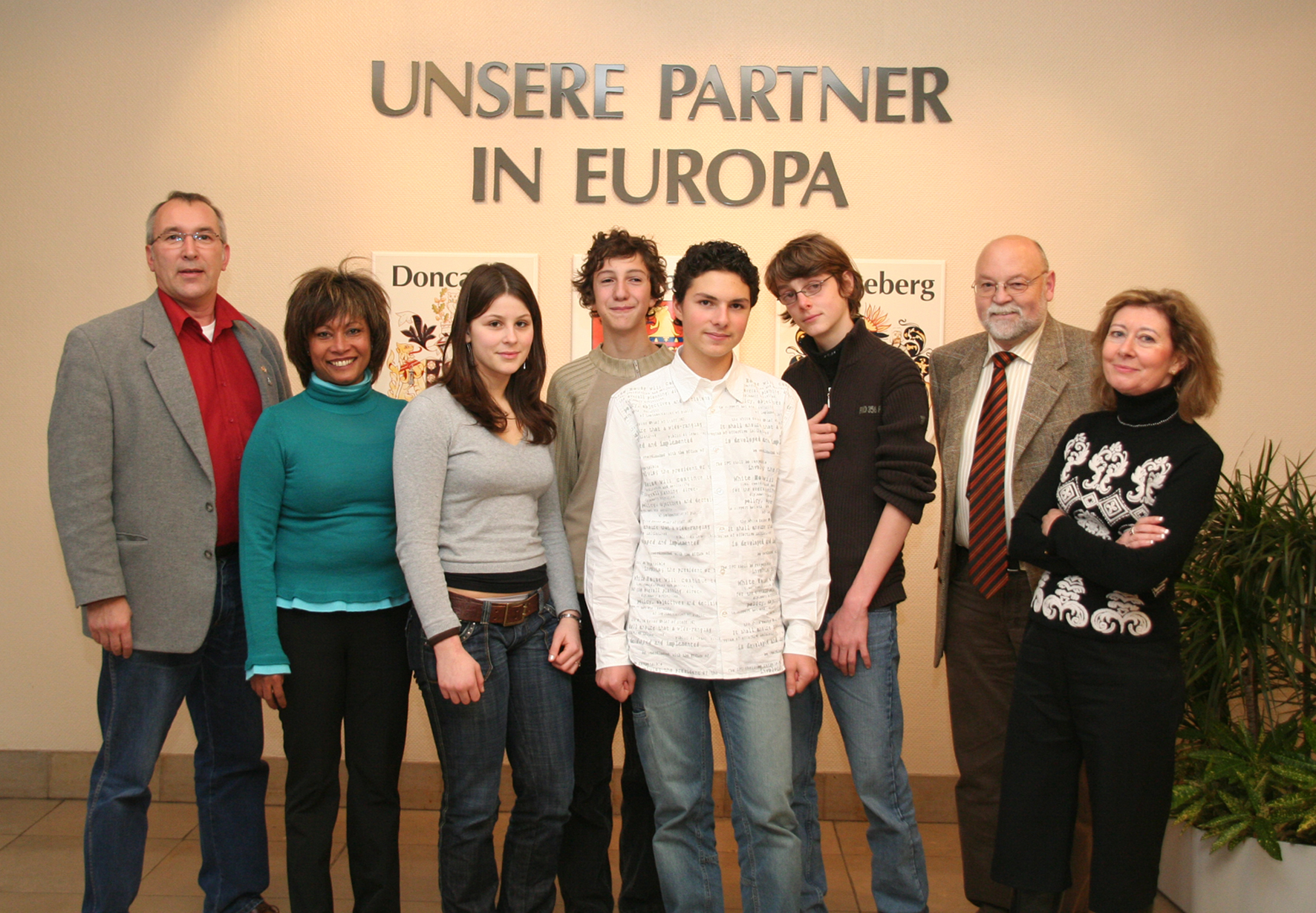Die Gewinner des Europa-Quiz' und ihre Begleiter: (v. l.) Vereinsmanager Detlef Fronda, Marie Déjean (Städtepartnerschaftsbeauftragte Arras), Charlotte Coronas, Tangrède Huet, Louis Desplanques, Edouard Cuvillon, Stellv. Bürgermeister Karl-Heinz Forst und Marie-Hélène Pentel (Lehrerin Arras)