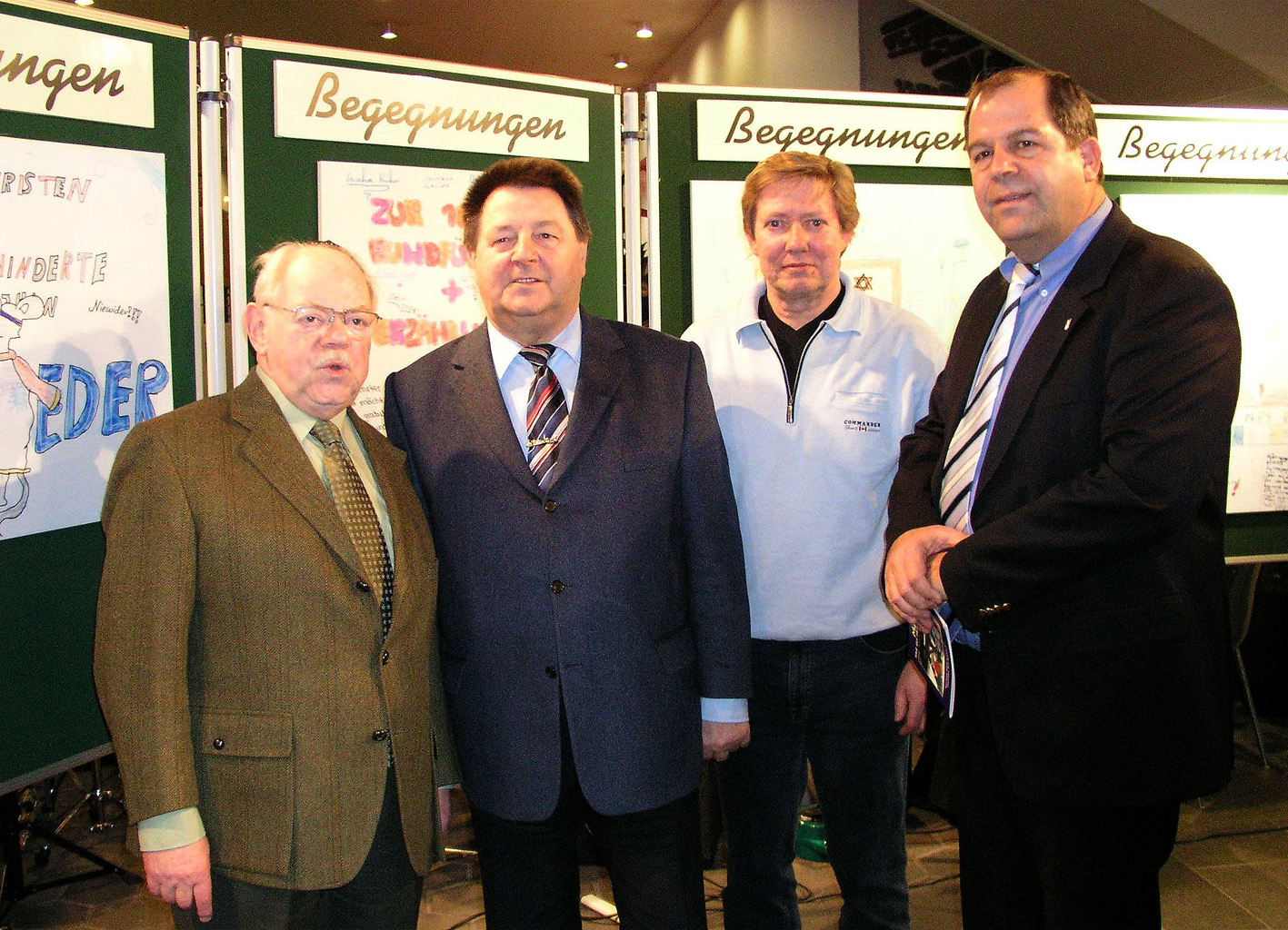 Bei der Eröffnung der Ausstellung "Begegnungen" im Iserlohner Rathausfoyer (v.l.n.r.): Der Iserlohner Zeitzeuge Carl-Heinz Kipper, Bürgermeister Klaus Müller, Jürgen Lensing vom Kinder- und Jugendbüro und Itzchak Ganor, Hauptdelegierter des Jüdischen Nationalfonds Jerusalem für Deutschland.