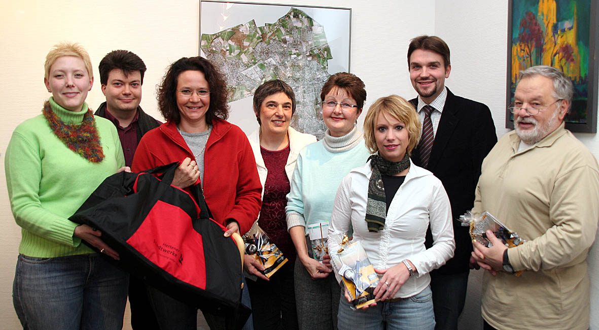Stadtwerke-Pressesprecherin Kerstin Walberg (li.) und Bürgermeister Dr. Uli Paetzel (2.v.r.) übergaben die Preise an (v.l.) Julien Courthial, Bettina Heidenreich, Heike Nawrath, Gisela Hedrich, Sandra Marciniak und Joachim Jürgens.