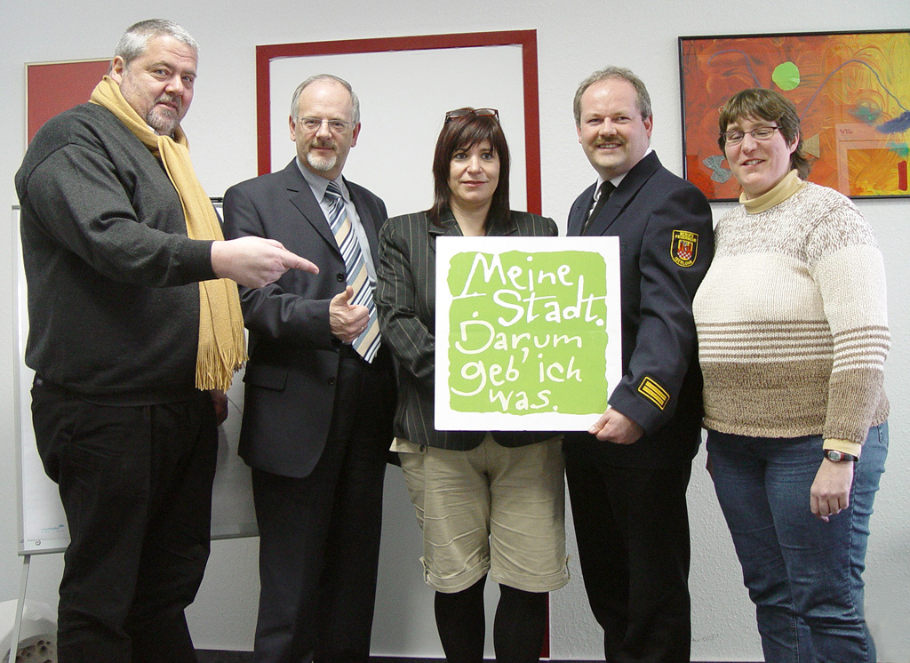 Stellten die eBay-Versteigerungen im Rahmen der Sponsoring-Aktion “Meine Stadt. Darum geb’ ich was.” im Iserlohner Rathaus vor (v.l.): Thomas Reunert, Redaktionsleiter des Iserlohner Kreisanzeigers, Friedhelm Kowalski, Ressortleiter Jugend, Schule, Soziales, Senioren und Sport, Marija Linnhoff vom Reisebüro Linnhoff, Christian Eichhorn, Leiter der Iserlohner Feuerwehr, und Ressortbüro-Mitarbeiterin Petra Grieger.