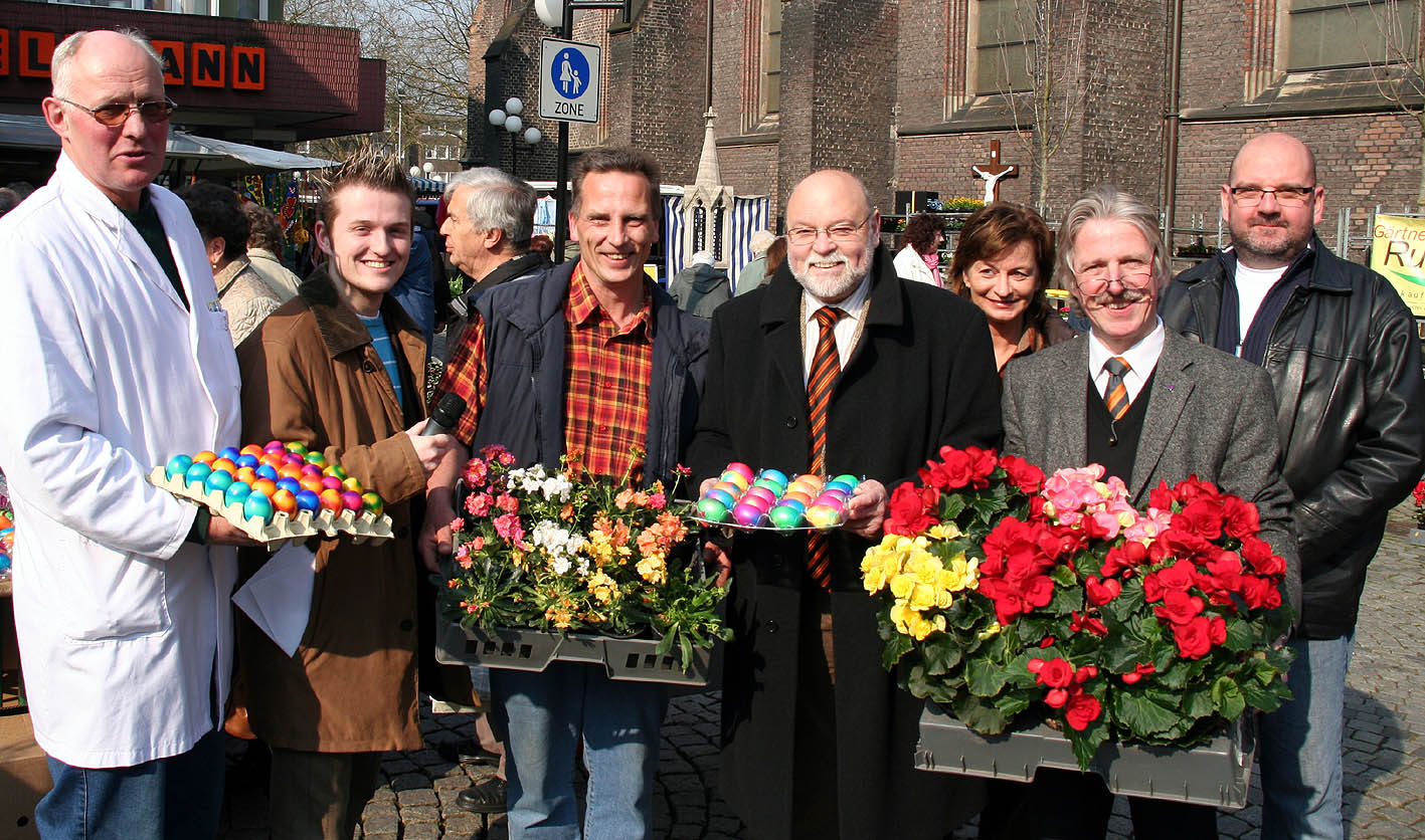 Viel Freude an der Aktion auf dem Wochenmarkt hatten neben Bürgermeister Karl-Heinz Forst auch Moderator Benedikt Hahn sowie die Vertreter des Marktvereins und der Innenstadtgemeinschaft "Lebendiges Herten".