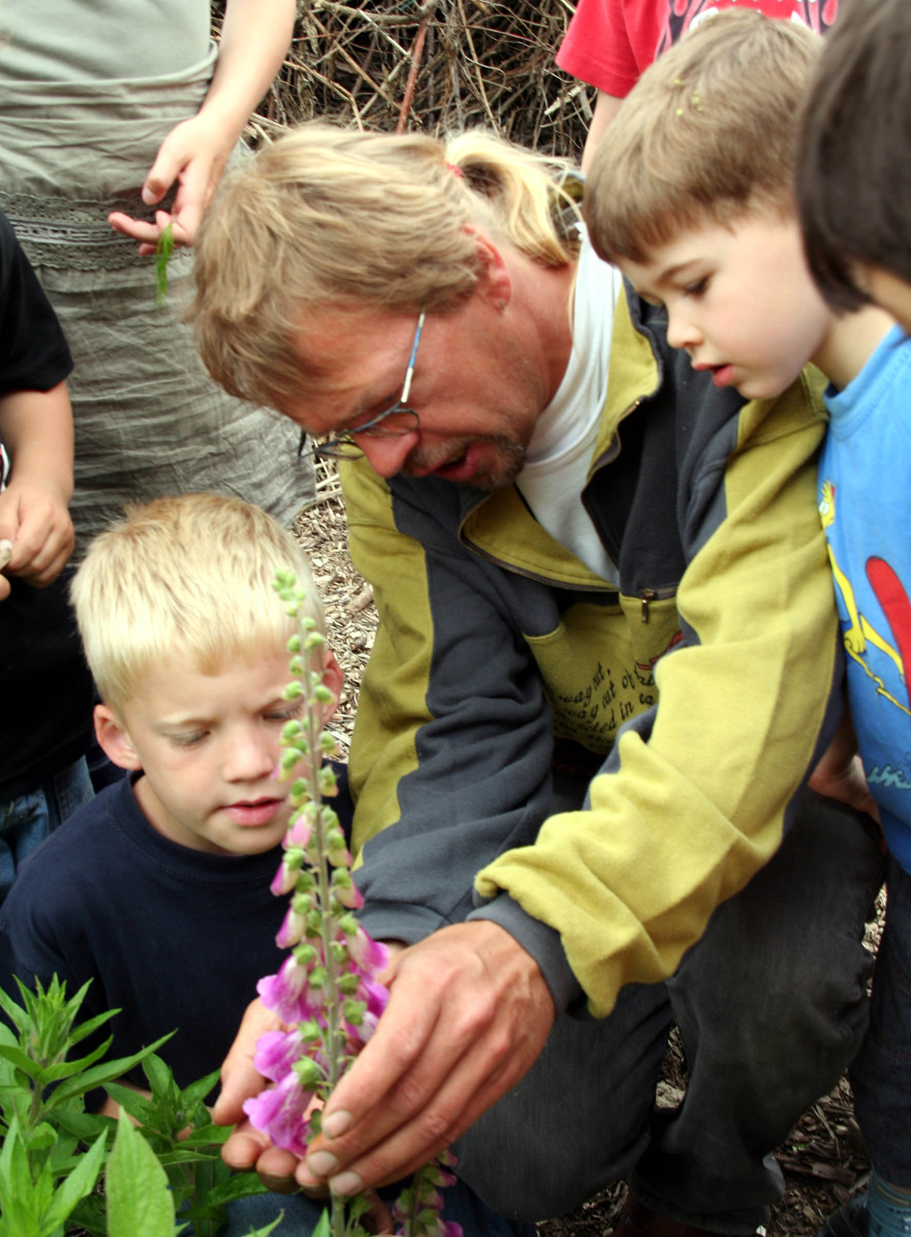 "Der Fingerhut heißt so, weil man in jede Blüte normalerweise einen Finger stecken kann", erklärt Uwe den Jungen und Mädchen. Aber: "Man sollte das auf keinen Fall tatsächlich tun, denn der Fingerhut ist sehr giftig."