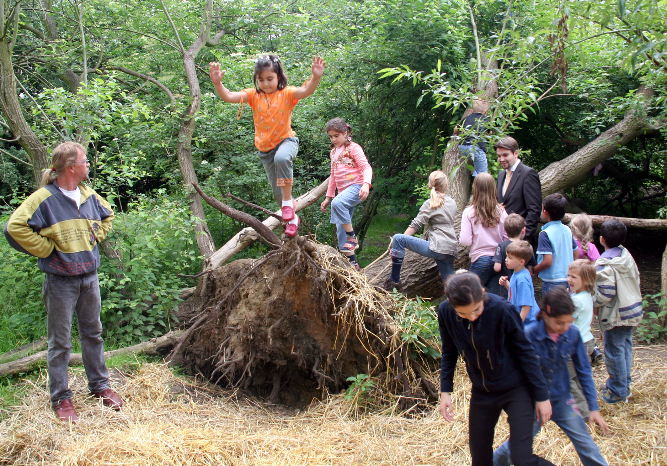 Vom Baum direkt ins Heu - der Satz in die Sprunggrube machte den kleinen Gästen sichtlich Spaß. Bürgermeister Dr. Uli Paetzel schaute begeistert zu und beantwortete auch manch eine Frage der Naturerlebnisgarten-Besucher.