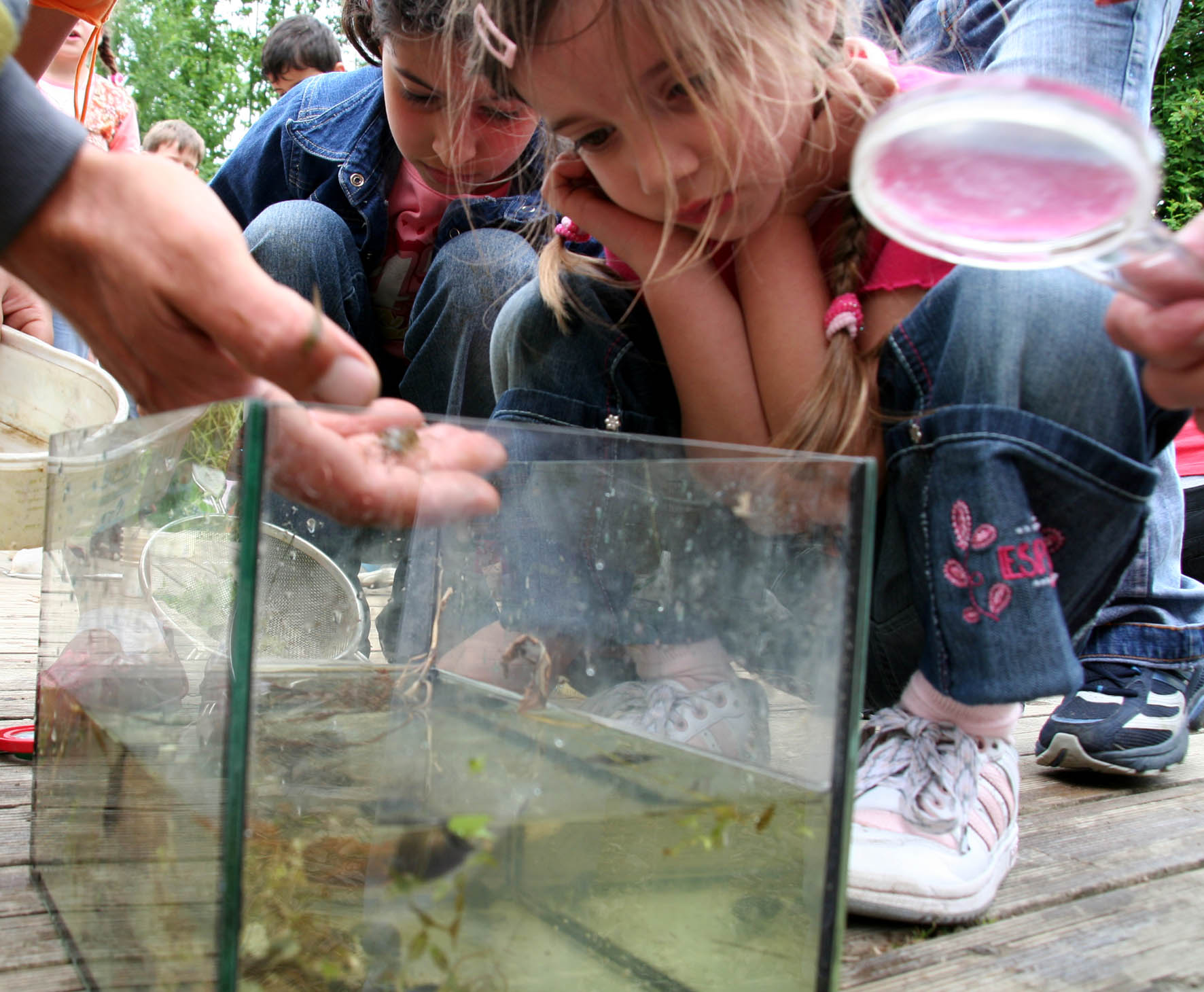 Genau unter die Lupe nehmen die Kinder die Tiere, die sie mit dem Kescher gefangen haben. Später dürfen sie aus dem Aquarium zurück in den Teich.