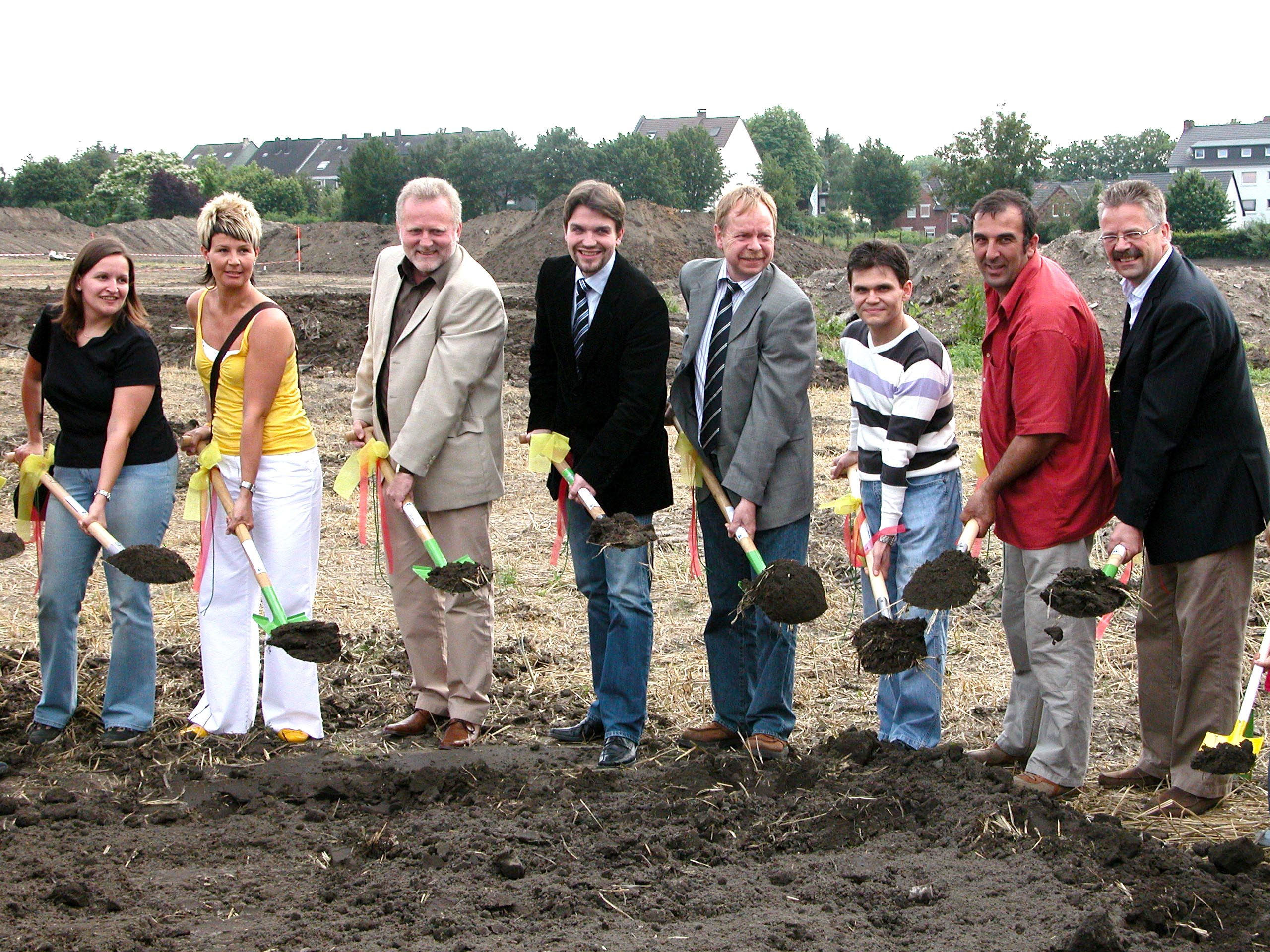 HTVG-Geschäftsführer Peter Brautmeier (rechts im Bild) mit Stadtwerke-Geschäftsführer Gisbert Büttner (3. v.l.), Bürgermeister Uli Paetzel, Stadtbaurat Lindner und weiteren Projekt-Beteiligten beim gemeinsamen Spatenstich.