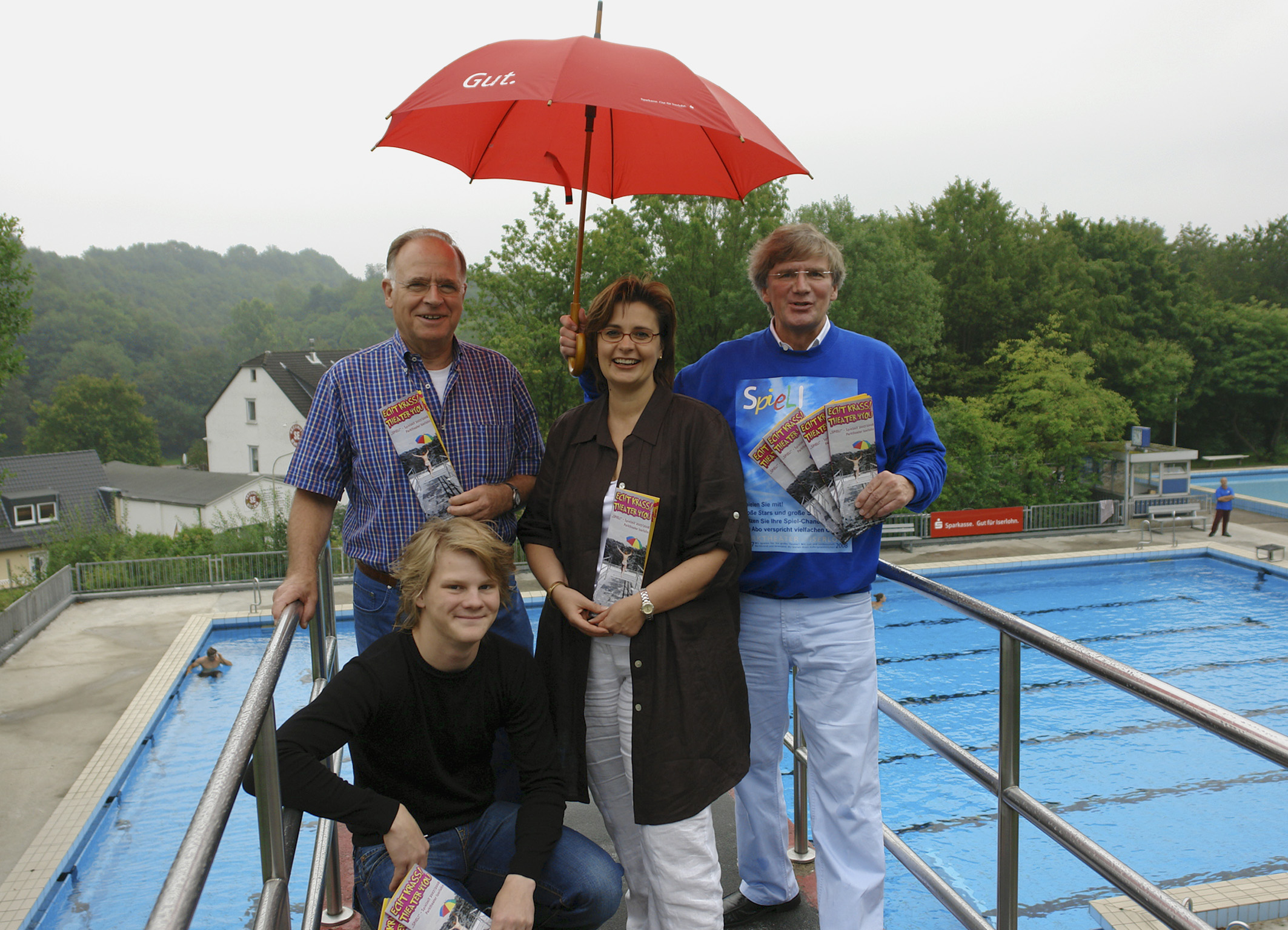 Tim Weßling, Fotograf des Titelbildes und ZEUS-Redakteur (vorne), Johannes Josef Jostmann, Direktor des Parktheaters Iserlohn, Ingeborg Woywod, Abteilungsdirektorin Vorstandssekretariat/PR der Sparkasse Iserlohn, und Hans Jürgen Dütemeyer, Lions Club Iserlohn (hinten von rechts nach links), stellten das Programmheft zur Jugendtheaterreihe "Echt krass! Theater4You" vor.