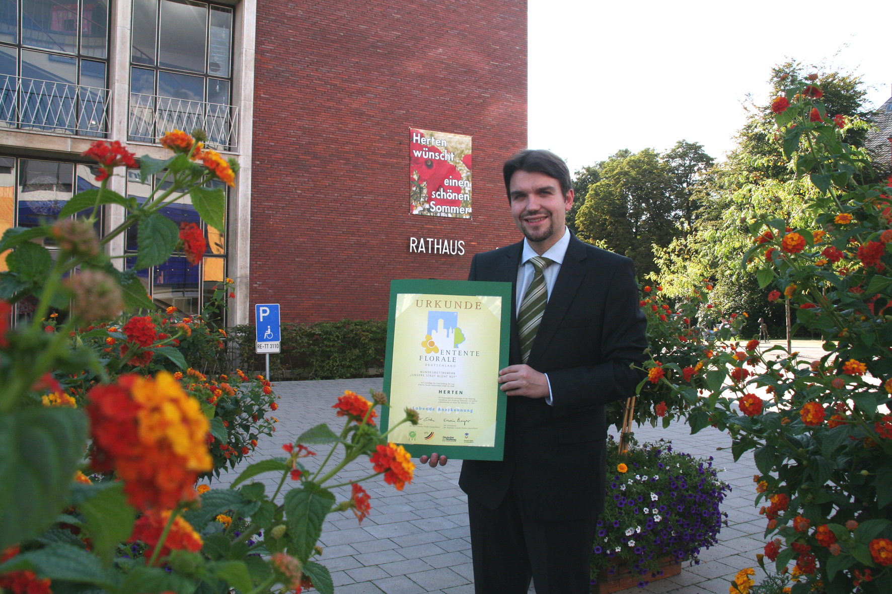 Bürgermeister Dr. Uli Paetzel präsentiert die Anerkennungsurkunde der Entente Florale 2007.
