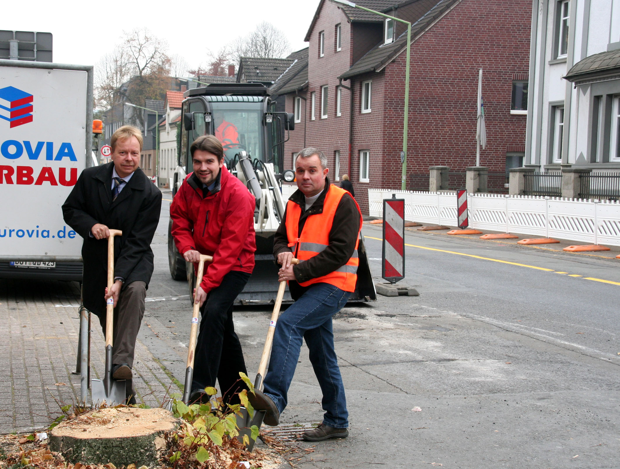 Beim offiziellen Spatenstich für die Umgestaltung der Herner Straße: Stadtbaurat Volker Lindner, Bürgermeister Dr. Uli Paetzel und Markus Zilken, Bereichsleitung der ausführenden Firma.