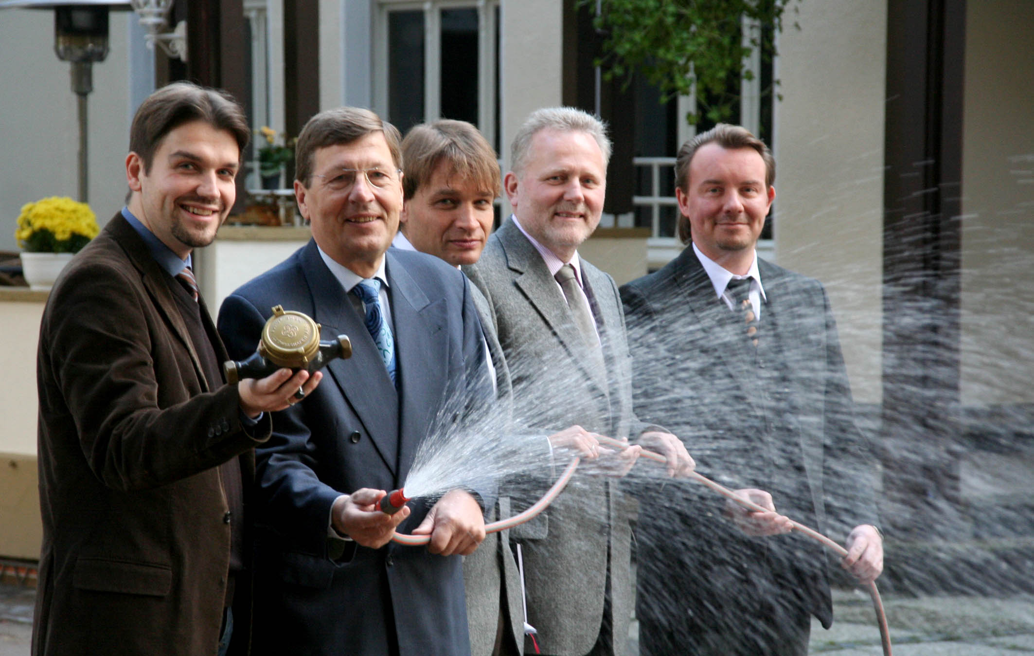 Ab Januar kommt aus den Leitungen in Herten "hertenwasser". Die Probe aufs Exempel starteten Bürgermeister Dr. Uli Paetzel, Gelsenwasser-Vorsitzender Dr. Manfred Scholle, Edgar Boer (hertenwasser-Geschäftsführer), Stadtwerke-Geschäftsführer Gisbert Büttner und Jochen Krämer (hertenwasser-Geschäftsführer).