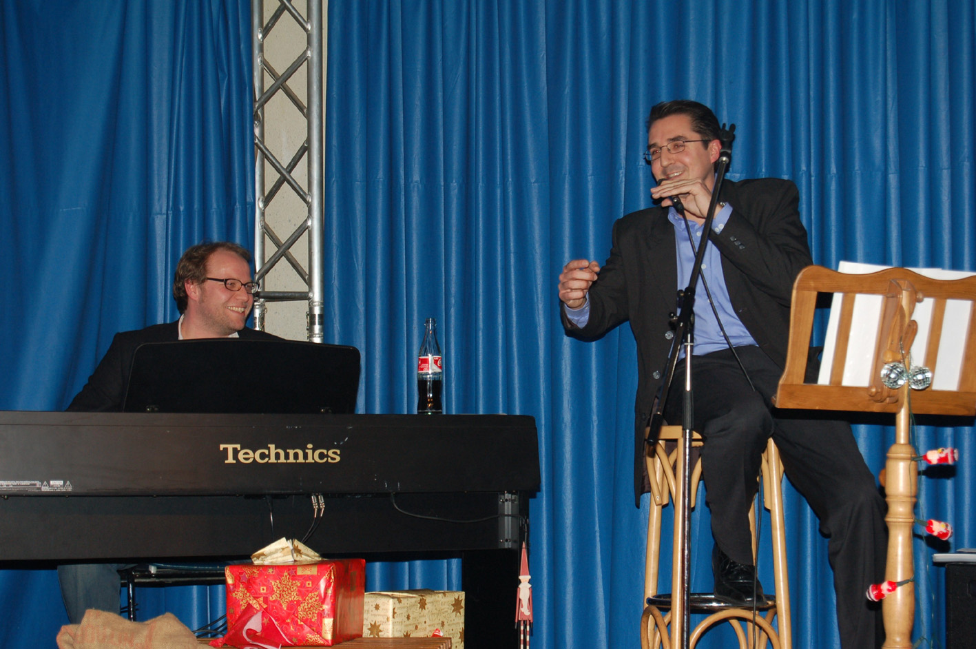 Sie sind zwei der “Weihnachtsmänner”, die beim weihnachtlichen “Kleinkunst-Naschwerk” im JuZ Karnacksweg in Iserlohn mitwirken: Andreas Thiemann (Klavier) und Michael Jatta (Gesang).