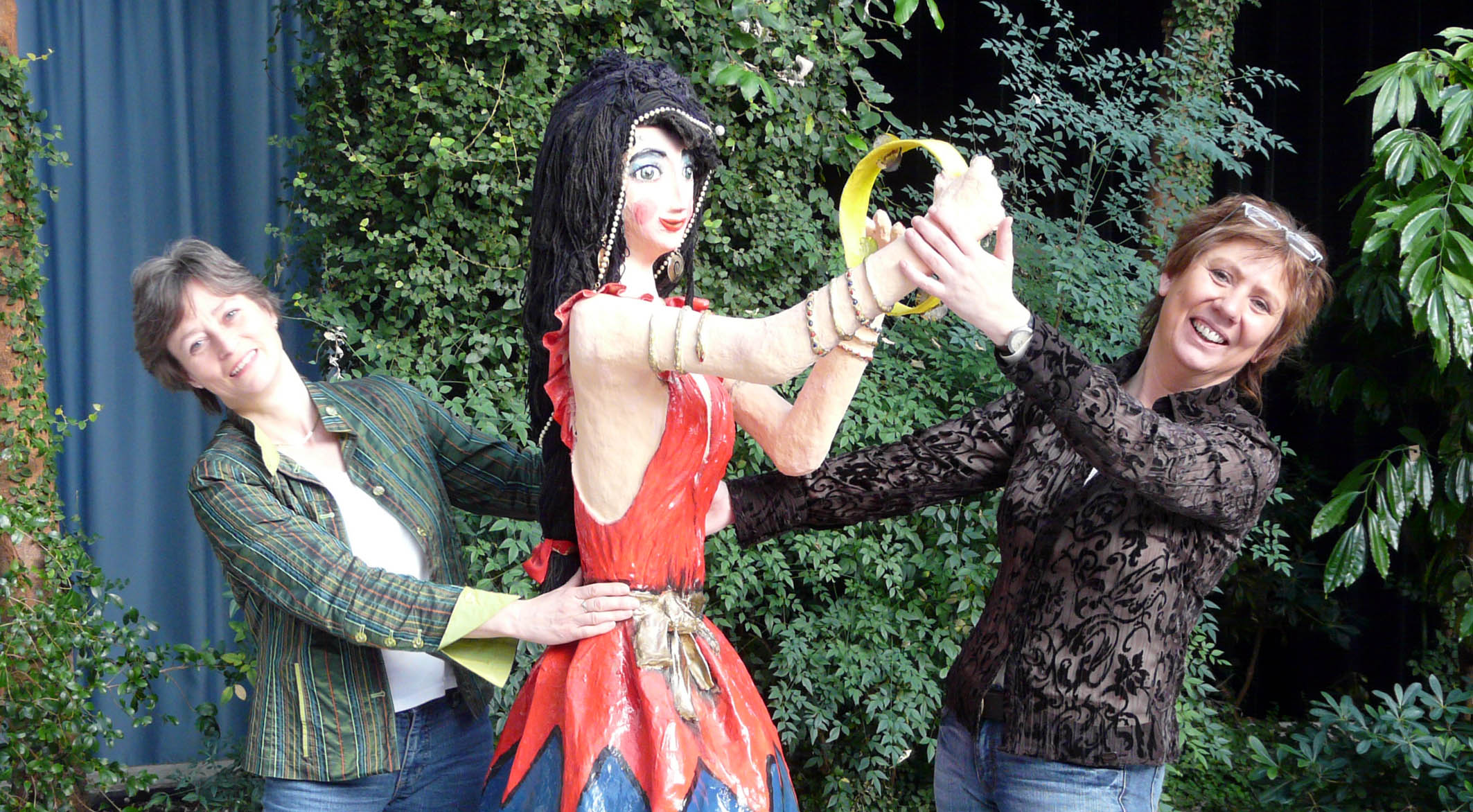 Bitten auf Ewald zum Tanz: Christiane Rohde, Gleichstellungsbeauftragte (li.), und Sabine Weißenberg, Organisatorin vom Kulturbüro der Stadt Herten, gemeinsam mit "Esmeralda", die für das Frauenfest vom Atelier Regenbogen gestaltet worden ist.
