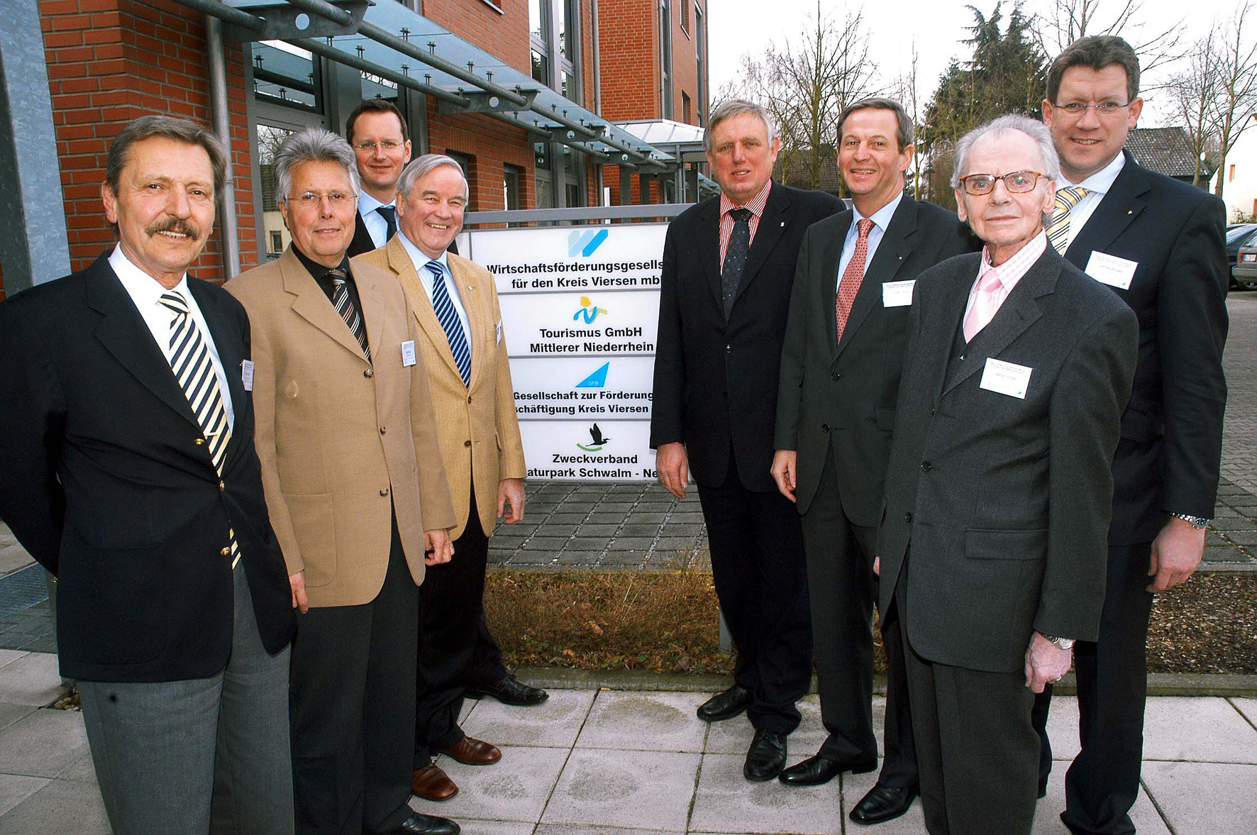 Karl-Josef Laumann, Minister für Arbeit, Gesundheit und Soziales des Landes NRW (4. von rechts) zu Besuch bei der GFB im Kreis Viersen: Peter Ewert, Vorsitzender der Geschäftsführung, Agentur für Arbeit Krefeld, Hans Kothen, Vorsitzender des Beirates der GFB, Christian Weisbrich, MdL, Dr. Stefan Berger, MdL, Landrat Peter Ottmann, Dietmar Brockes, MdL und Werner Schieß, Geschäftsführer GFB (von links), begrüßten den Minister. Foto: Horst Siemes/Kreis Viersen – Abdruck honorarfrei