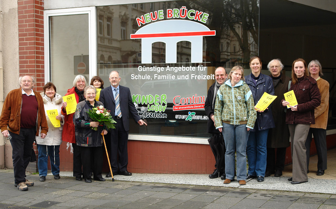 Am Hohler Weg 51 werden ab April zwei Mal pro Woche Schulmaterialien, Haushaltswaren, Spiele, Bücher und Spielzeug zu sehr günstigen Preisen angeboten. Bei einem Pressetermin stellten Vertreter der Stadt Iserlohn, des ehrenamtlichen Dienstes “Continue” und der Kinderlobby Iserlohn das Gemeinschaftsprojekt “Neue Brücke” vor, das in dem Ladenlokal von Anneliese Schleicher (vierte v. l.) sein Domizil gefunden hat.