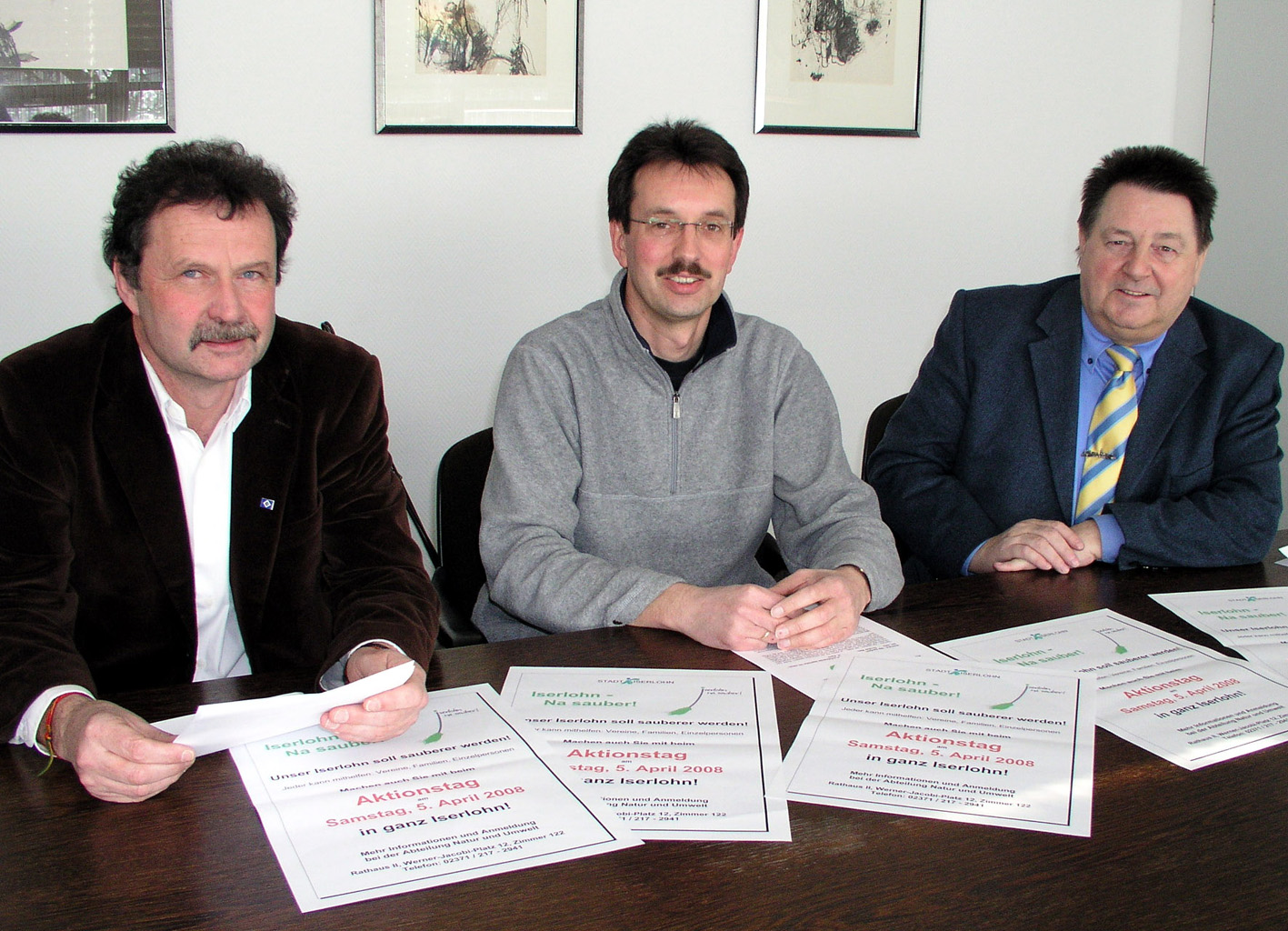 Die Aktion “Iserlohn - Na sauber!” wird fortgesetzt. Bürgermeister Klaus Müller (rechts) und die Organisatoren von der Abteilung Natur und Umwelt, Abteilungsleiter Herbert Goldmann (links) und Dirk Lachmuth, laden ein zum Aktionstag am Samstag, 5. April 2008.