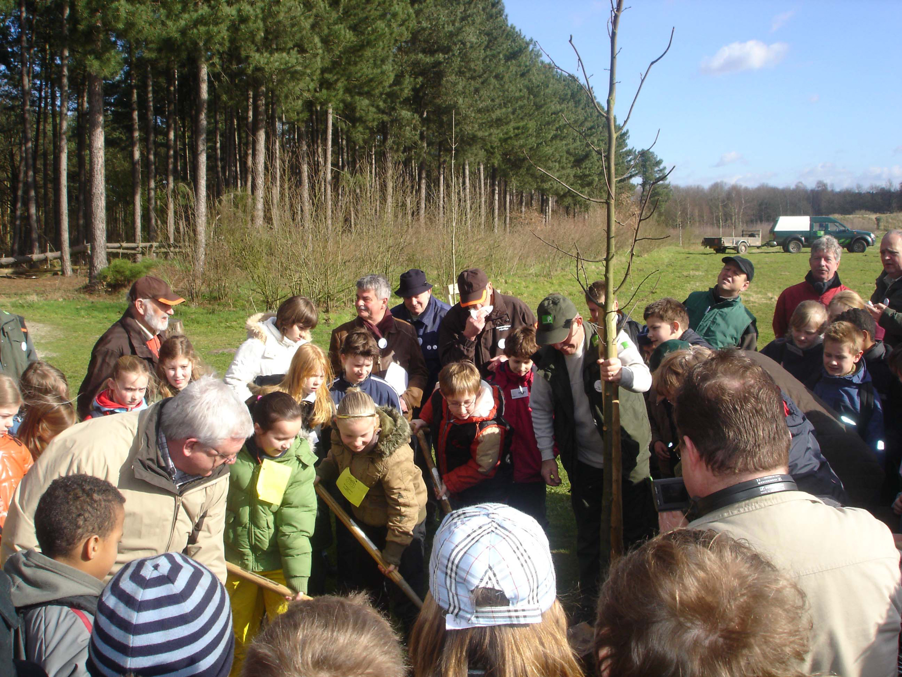 Gemeinsam mit Friedrich-Wilhelm Stevens, dem Vorsitzenden der Verbandsversammlung des Naturparks Schwalm-Nette (links), pflanzten 73 Kinder einen Erinnerungsbaum am Besucherzentrum De Meinweg. Foto: Naturpark Schwalm-Nette - Abdruck honorarfrei