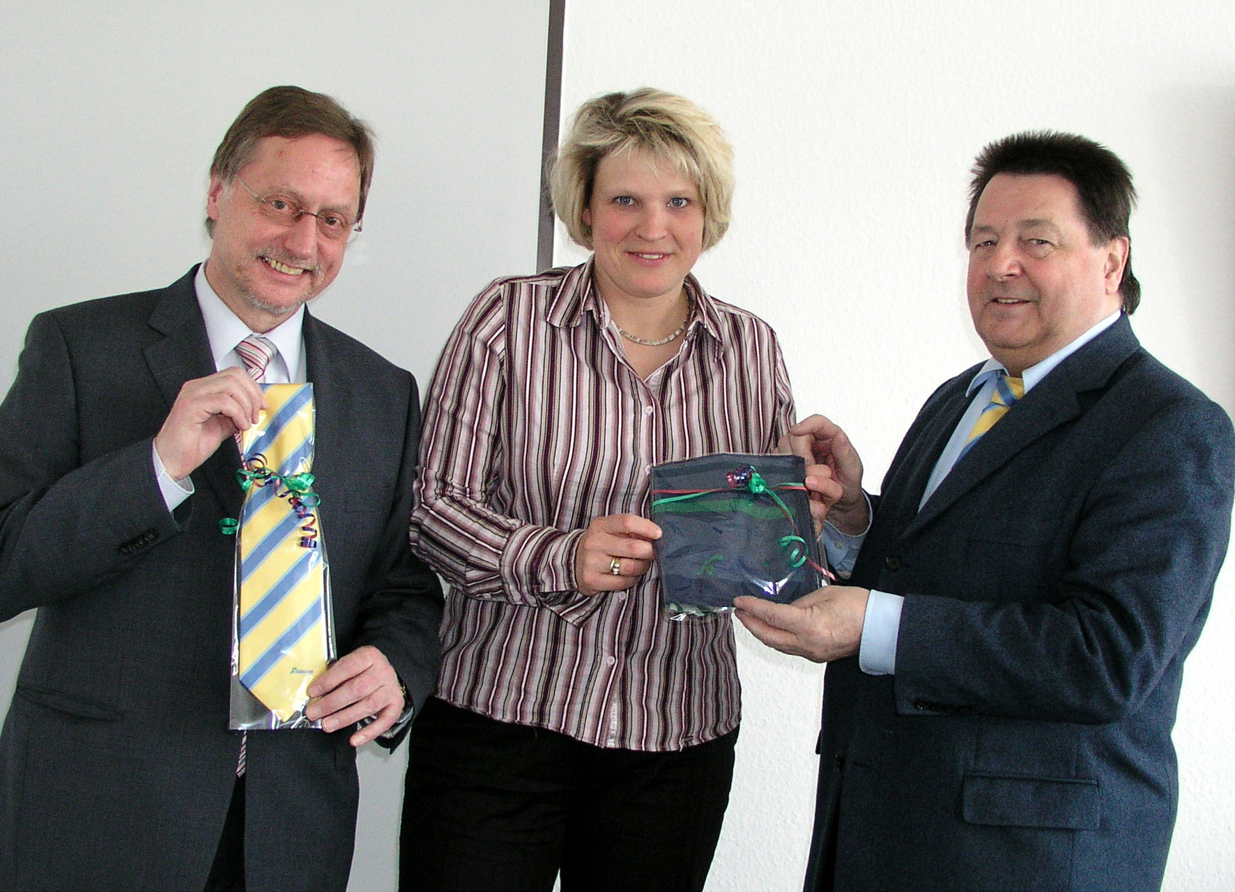 Bei der Presse-Vorstellung im Iserlohner Rathaus überreichte Bürgermeister Klaus Müller der neuen Ressortleiterin das offizielle Iserlohn-Tuch und dem neuen SWI-Leiter die offizielle Stadtkrawatte.