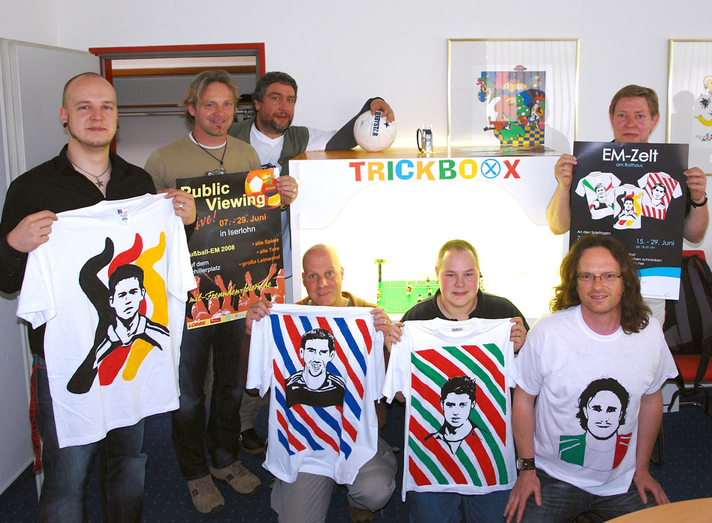 Mitarbeiter der städtischen Sozialraumteams, des Kinder- und Jugendbüros und des Sportbüros laden alle Jugendlichen während des Public Viewing zu abwechslungsreichen Kreativangeboten für "echte Fußball-Fans" ins "EM-Zelt" vor dem Iserlohner Rathaus ein (v.l.n.r.): Michael Nitsche, Michael Jüdt, Frank Müller, Andreas Lippert, Fern Ströter, Bernd Schulte und Jürgen Lensing.