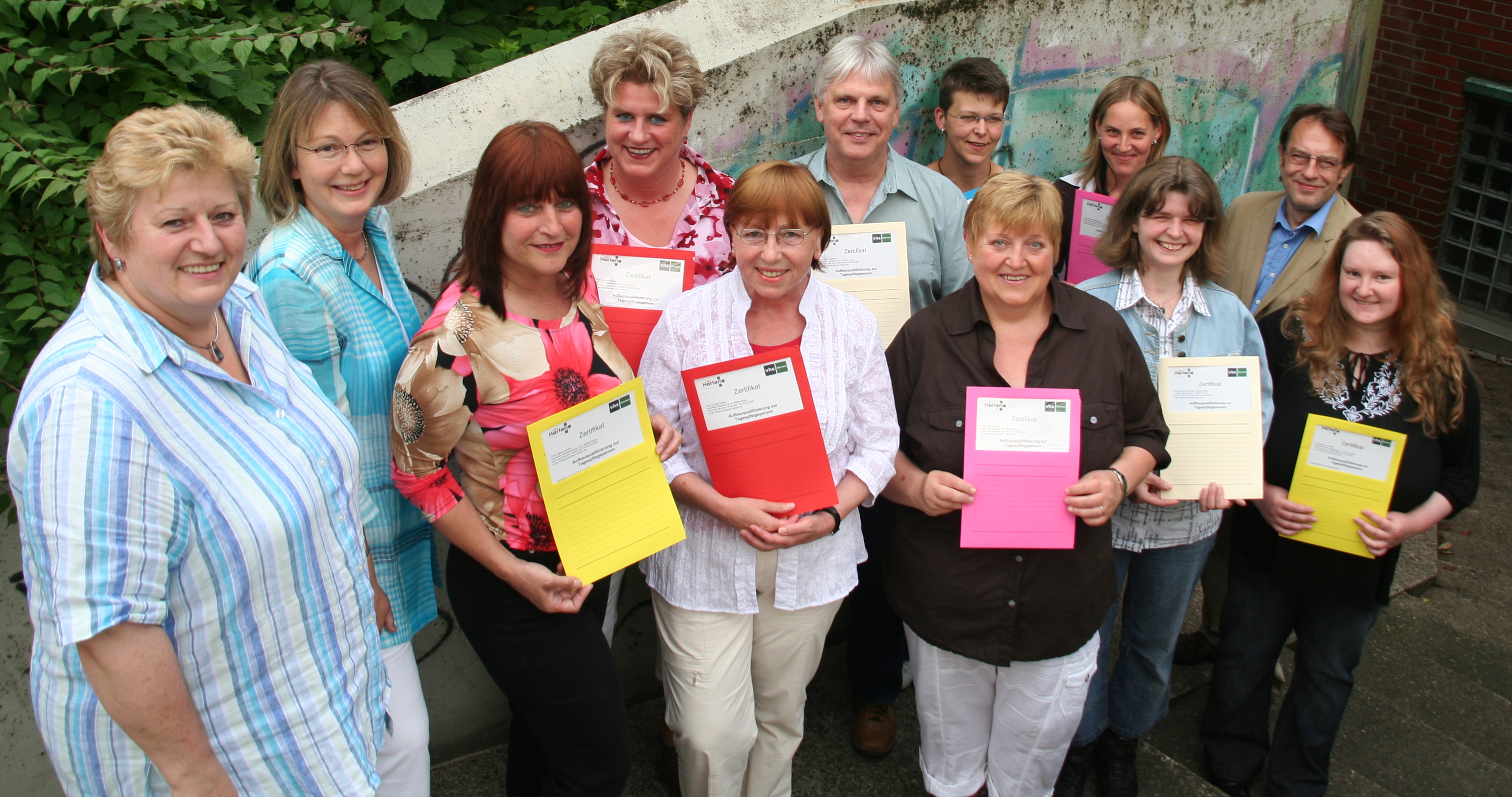 v.l.: Elisabeth Eckert und Christine Adam-Blume (beide Stadt Herten). Hinten v.l.: Susanne Buttler, Bernd Kettler, Michaela Kirschner-Tomaschewski, Sabina Bambach und Manfred Nousch (VHS). Vorne v.l.: Sigrun Walden, Christa Cheylan, Irene Nachlik, Sigrun Böttcher und Jasmin Janssen.