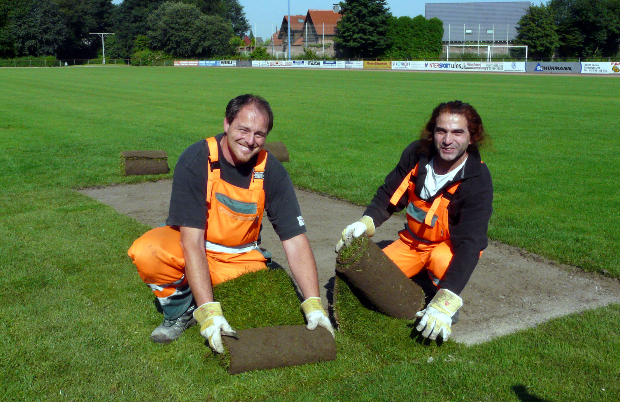Andreas Hallmann (li.) und Erol Ates "flicken" den Rasenplatz der Sportanlage Nord. Im Torbereich und am Elfmeterpunkt verlegen sie neuen Rollrasen. Damit in der neuen Saison bei der SGL der Ball wieder rund läuft.