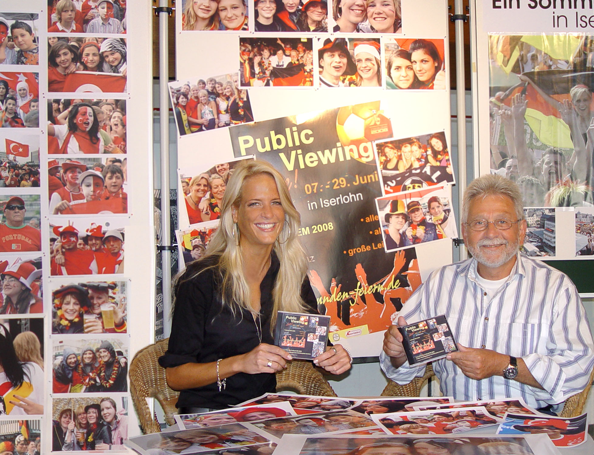 Klaus Schlünder und Jana Simon von der Abteilung Stadtwerbung präsentieren die Foto-DVD vor der Ausstellung im Rathaus-Foyer.