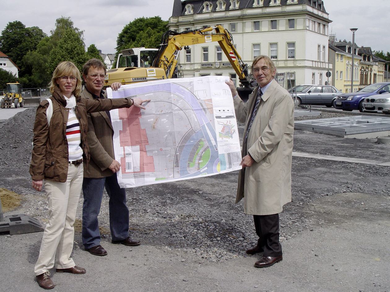 Von rechts: Erster Beigeordneter Dr. Peter Paul Ahrens, der Bereichsleiter Stadtbauwesen Rüdiger Klincke und die Leiterin des Büros für Stadtentwicklung Gabriele Bilke erläuterten den Stand der Baumaßnahmen rund um den “Stadtbahnhof Iserlohn” und die Fertigstellung der Straße Altstadt.