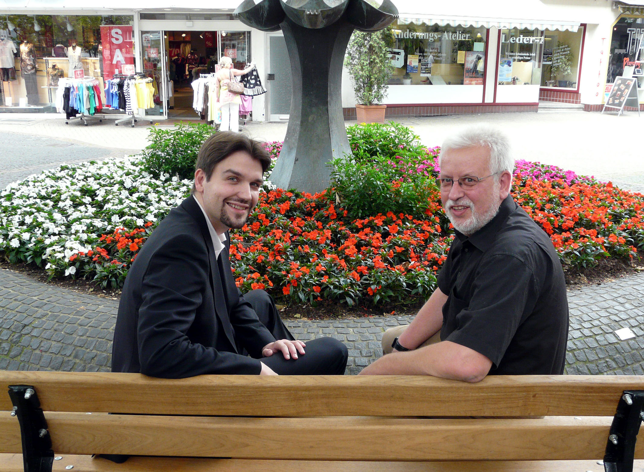 Erfreuen sich an der farbenfrohen Bepflanzung des Brunnens in der City: Bürgermeister Dr. Uli Paetzel und Egon Walberg, zuständig unter anderem für Stadtbildpflege.