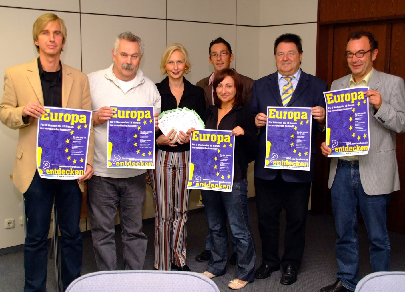 Die von der Europäischen Union geförderte Beratungplattform für den “Europäischen Freiwilligendienst” unterstützt Jugendliche in Iserlohn und Hagen, die bis zu einem Jahr in einem gemeinnützigen Projekt in einem europäischen Land verbringen möchten. Bei einem Pressetermin im Iserlohner Rathaus stellten Bürgermeister Klaus Müller (2.v.r.), Dirk Schubert (links), Experte für die Beratung Jugendlicher im Europäischen Freiwilligendienst, sowie Mitarbeiter des städtischen Büros für Europaangelegenheiten und Vertreter der Ev. Jugendbildungsstätte Berchum und des Ev. Jugendreferates des Kirchenkreises Iserlohn das Projekt vor