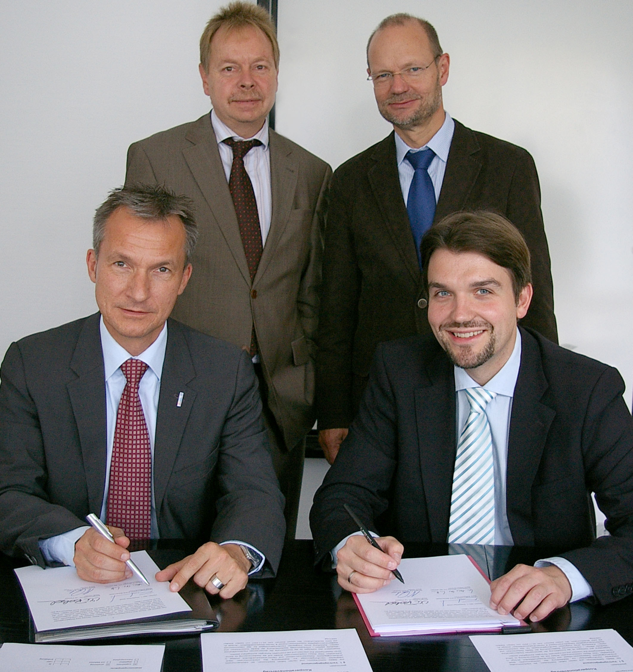 Bei der Unterzeichnung des Kooperationsvertrags zwischen den Städten Herten und Gelsenkirchen: Die beiden Bürgermeister Frank Baranowski (li.) und Dr. Uli Paetzel sowie Hertens Baurat Volker Lindner (hi. li.) und Gelsenkirchens Stadtdirektor Michael von der Mühlen.