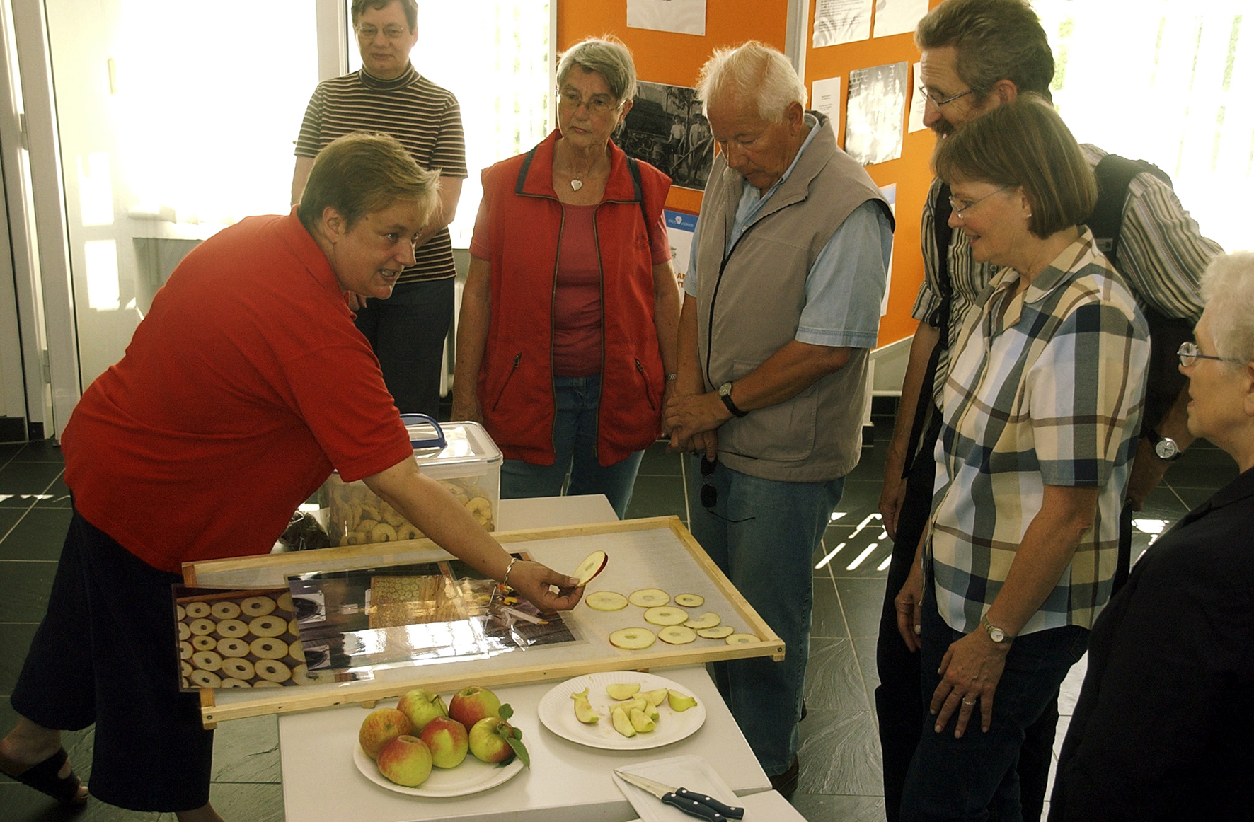 Trockenobst-Expertin Barbara Gierthmühlen aus Kempen zeigte im Niederrheinischen Freilichtmuseum in Grefrath die Herstellung von Trockenobst. Foto: Horst Siemes/Kreis Viersen - Abdruck honorarfrei