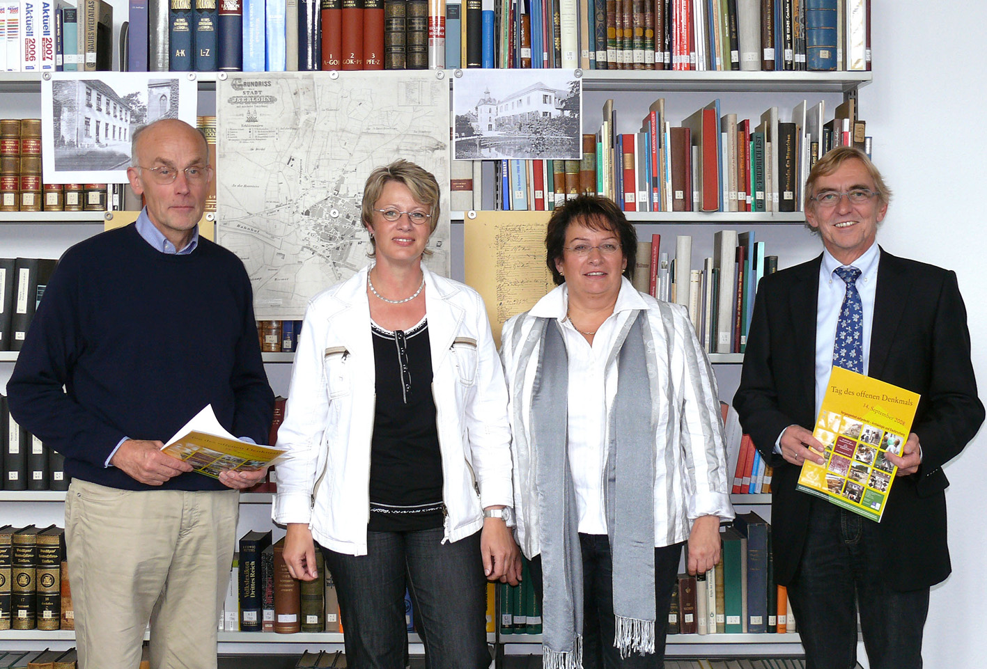Stellten das Iserlohner Programm zum Tag des offenen Denkmals 2008 vor: Erster Beigeordneter und Ressortleiter Planen, Bauen, Wohnen Dr. Peter Paul Ahrens (r.), Abteilungsleiterin Bauaufsicht und Denkmalpflege Christina Langhammer-Gloerfeld (2.v.r.) und Mitarbeiterin Heike Berlinski sowie Stadtarchivar Götz Bettge.