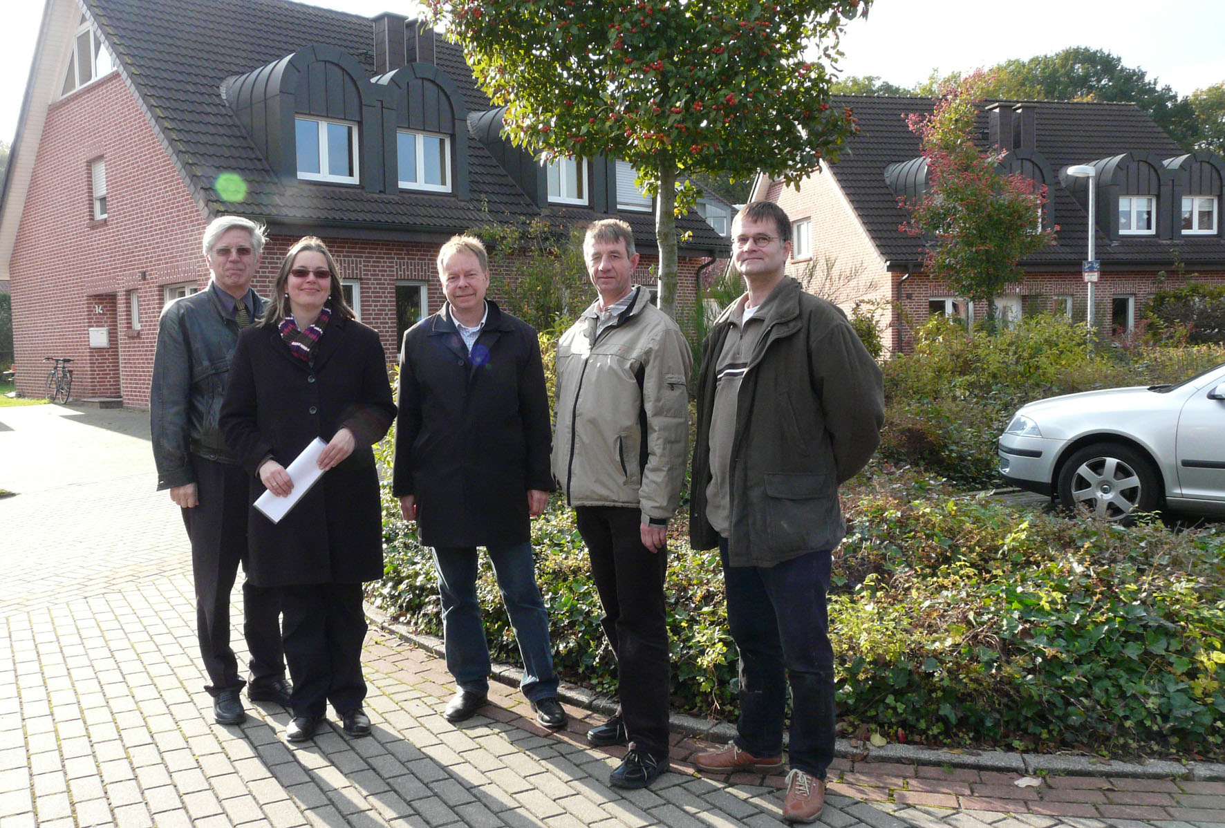 Berthold Tönnes (Architekt), Sabine Tönnes (Architektin), Stadtbaurat Volker Lindner, Peter Kipp (Bauleiter) und Uwe Speikamp (Planung) (v.l.) besuchten die fertig gestellte Siedlung in Herten-Scherlebeck.