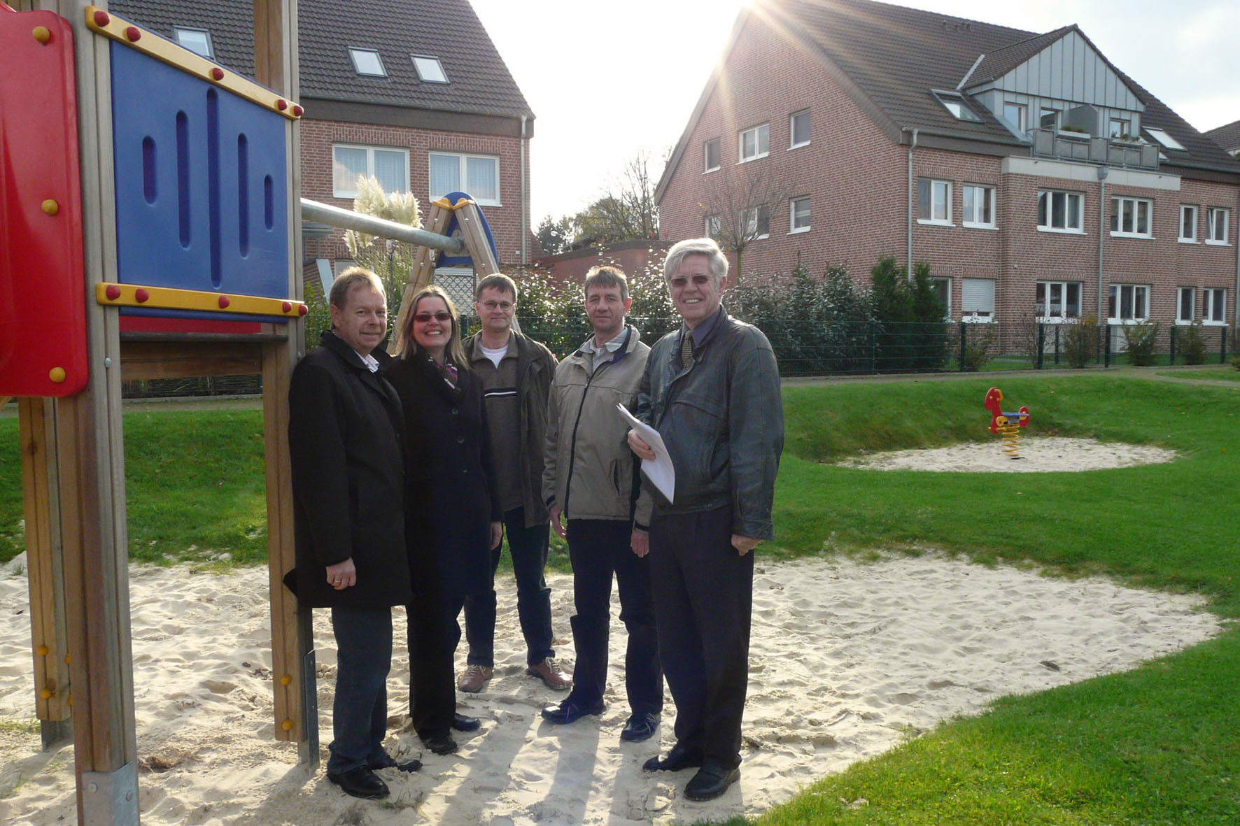 Stadtbaurat Volker Lindner, Sabine Tönnes (Architektin), Peter Kipp (Bauleiter), Uwe Speikamp (Planung) und Berthold Tönnes (Architekt) (v.l.) besuchten die fertig gestellte Siedlung in Herten-Scherlebeck.