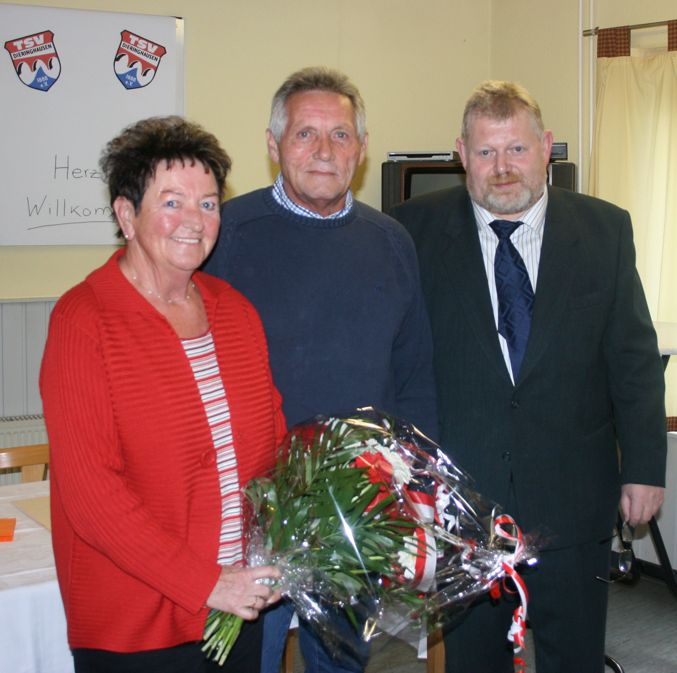 Dank für langjährige Hausmeistertätigkeit: Jupp Lenger (Mitte) geht in den wohlverdienten Ruhestand. TSV-Vorsitzender Werner Bubenzer (re.) dankte auch Lengers Frau Anita, die ihrem Mann stets den Rücken freigehalten hat. (Foto: Stadt Gummersbach - Siegfried Frank)