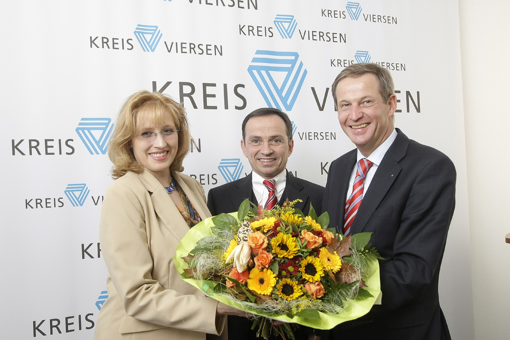 Landrat Peter Ottmann (rechts) und Ludger Gooßens, Vorstandsvorsitzender der Sparkasse Krefeld, gratulieren Iris Kater zu ihrer hervorragenden Platzierung beim Bundes-Bürgerpreis. Foto: Alois Müller/Kreis Viersen - Abdruck honorarfrei